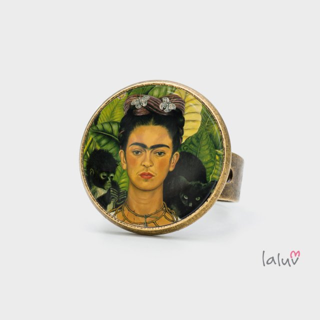 Ręcznie robiony pierścionek z wysokiej jakości grafiką zamkniętą pod wypukłym szkiełkiem i oprawioną w bazę w kolorze antycznego złota.