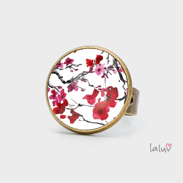 Ręcznie robiony pierścionek z wysokiej jakości grafiką zamkniętą pod wypukłym szkiełkiem i oprawioną w bazę w kolorze antycznego złota.