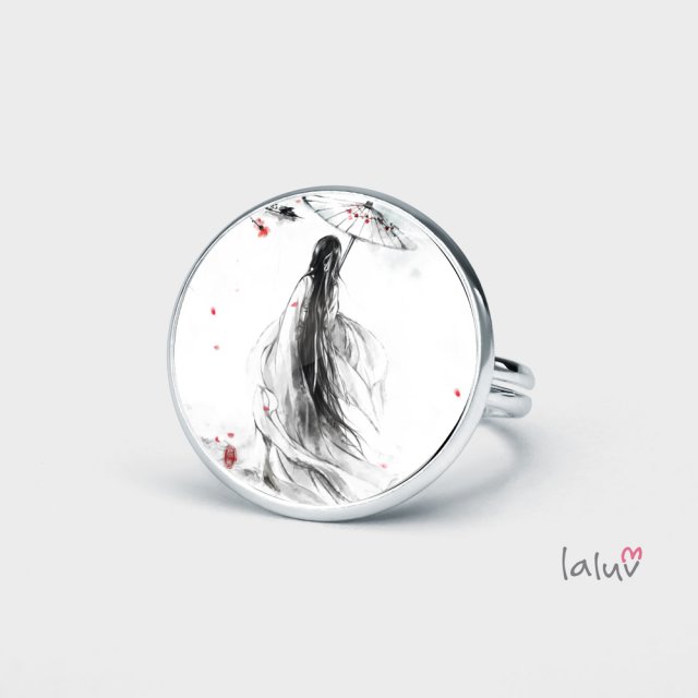 Ręcznie robiony pierścionek z wysokiej jakości grafiką zamkniętą pod wypukłym szkiełkiem i oprawioną w bazę w kolorze srebrnym.