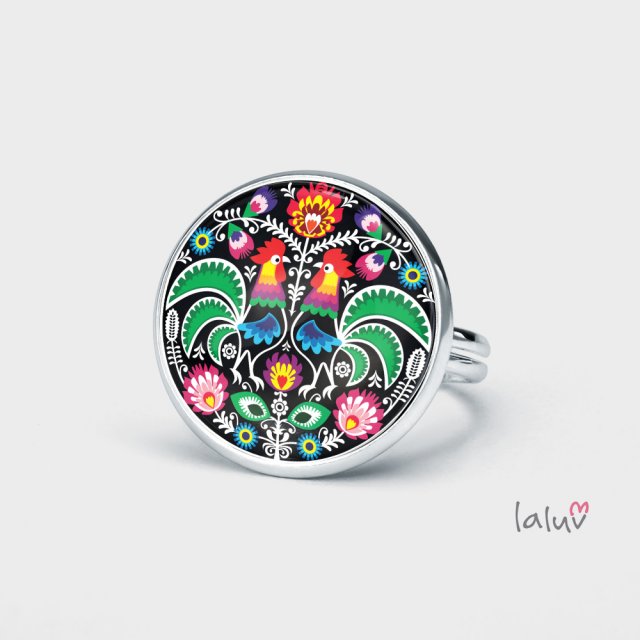 Ręcznie robiony pierścionek z wysokiej jakości grafiką zamkniętą pod wypukłym szkiełkiem i oprawioną w bazę w kolorze srebrnym.
