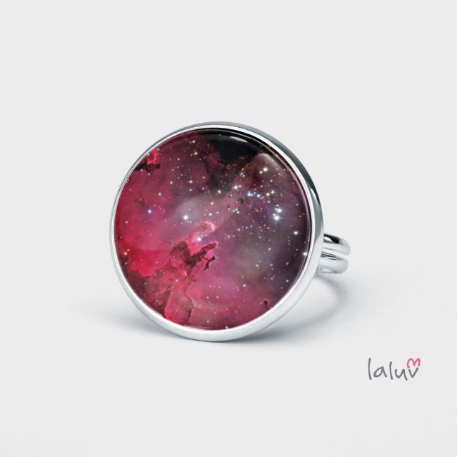 Ręcznie robiony pierścionek z wysokiej jakości grafiką zamkniętą pod wypukłym szkiełkiem i oprawioną w bazę w kolorze srebrnym.