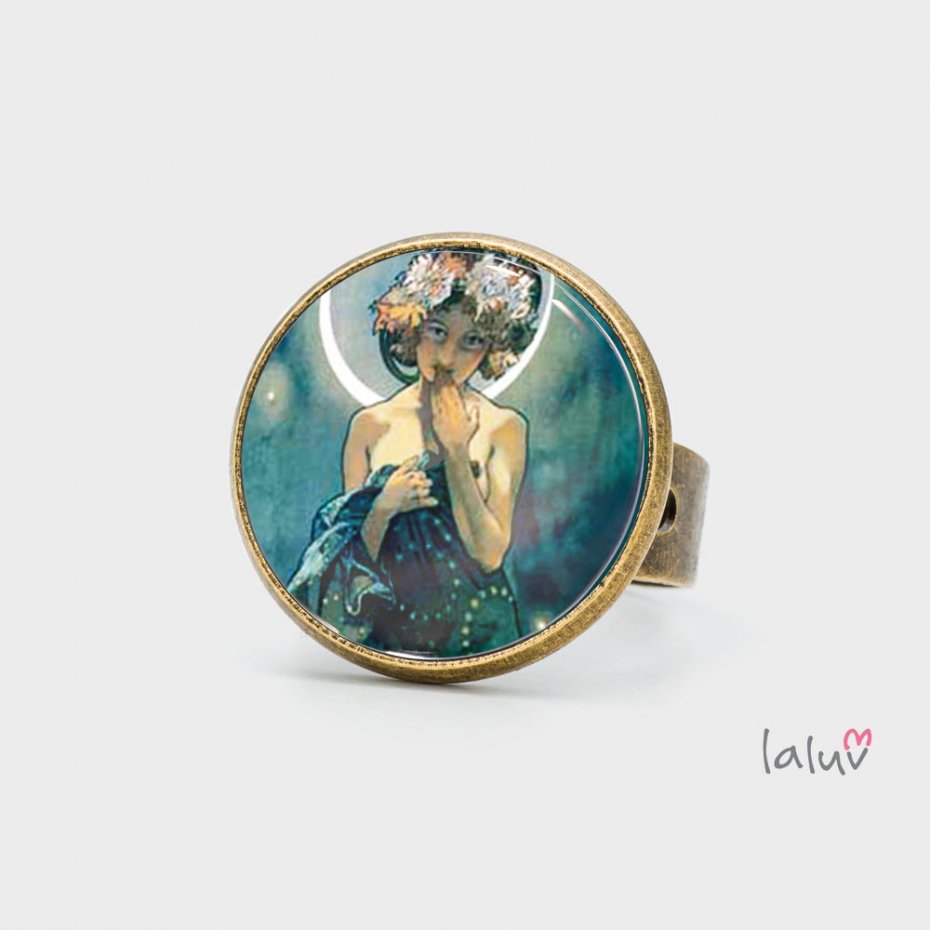 Ręcznie robiony pierścionek z wysokiej jakości grafiką zamkniętą pod wypukłym szkiełkiem i oprawioną w bazę w kolorze antycznego złota.
