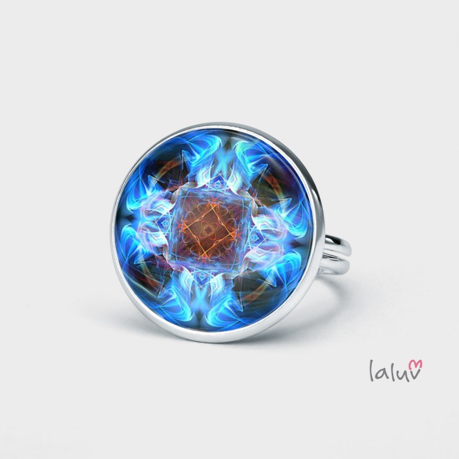 Ręcznie robiony pierścionek z wysokiej jakości grafiką zamkniętą pod wypukłym szkiełkiem i oprawioną w bazę w kolorze srebrnym.