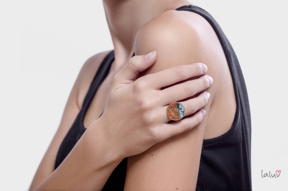 Ręcznie robiony pierścionek z wysokiej jakości grafiką zamkniętą pod wypukłym szkiełkiem i oprawioną w bazę w kolorze antycznego złota.