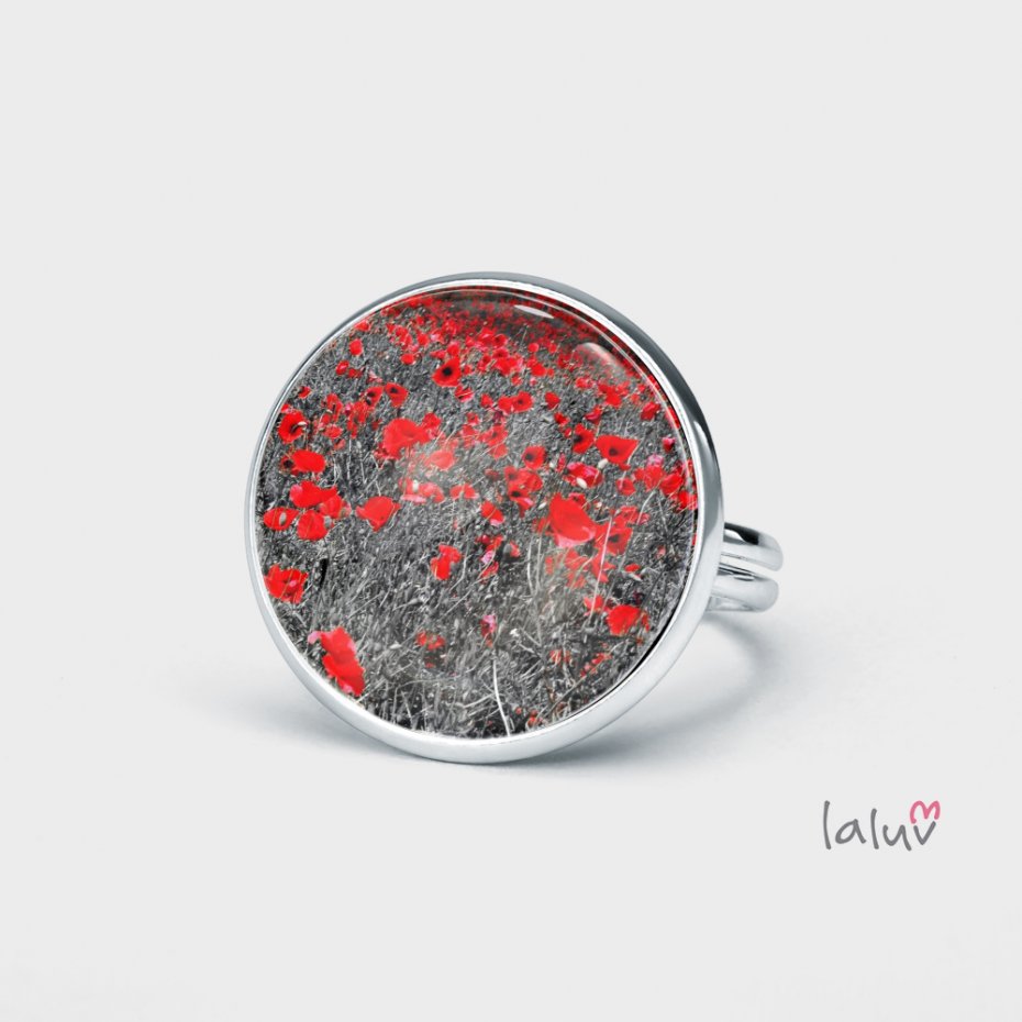 Ręcznie robiony pierścionek z wysokiej jakości grafiką zamkniętą pod wypukłym szkiełkiem i oprawioną w bazę w kolorze srebrnym.