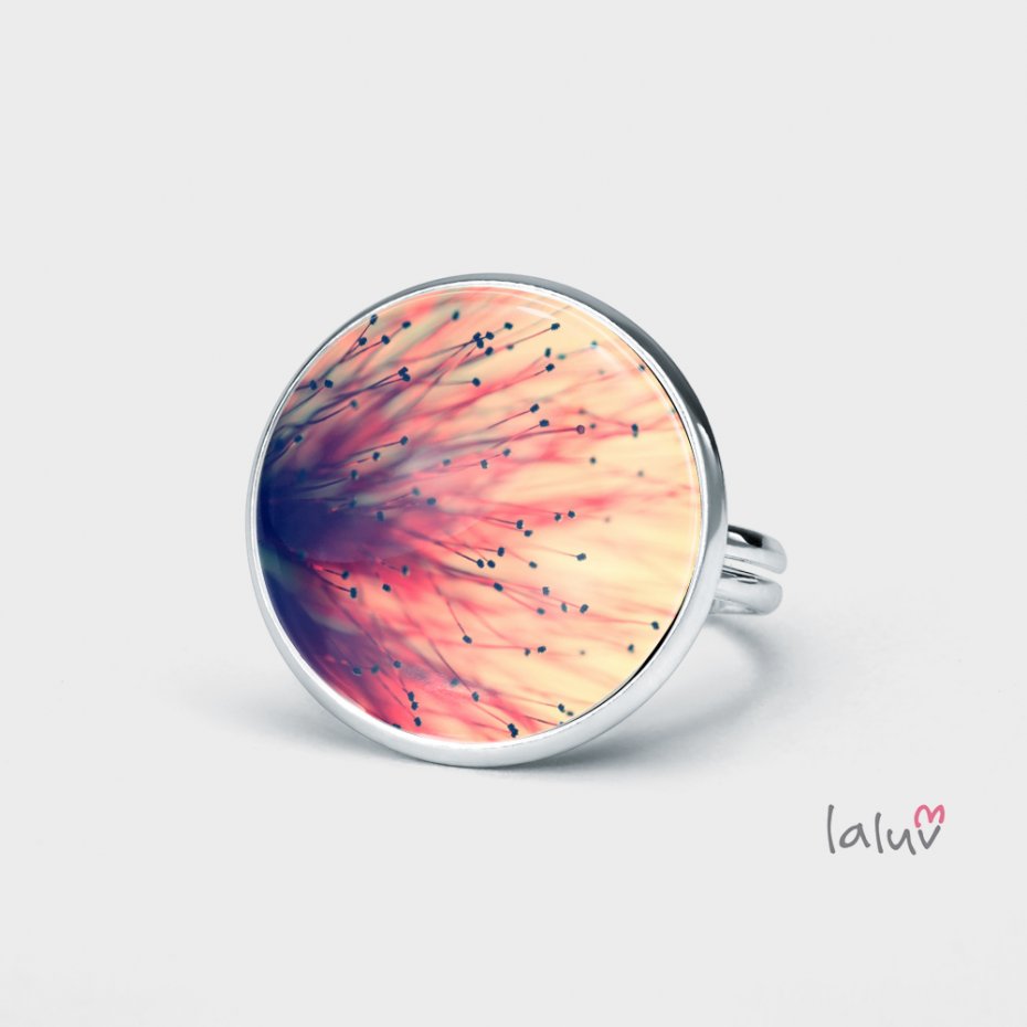 Ręcznie robiony pierścionek z wysokiej jakości grafiką zamkniętą pod wypukłym szkiełkiem i oprawioną w bazę w kolorze srebrnym.