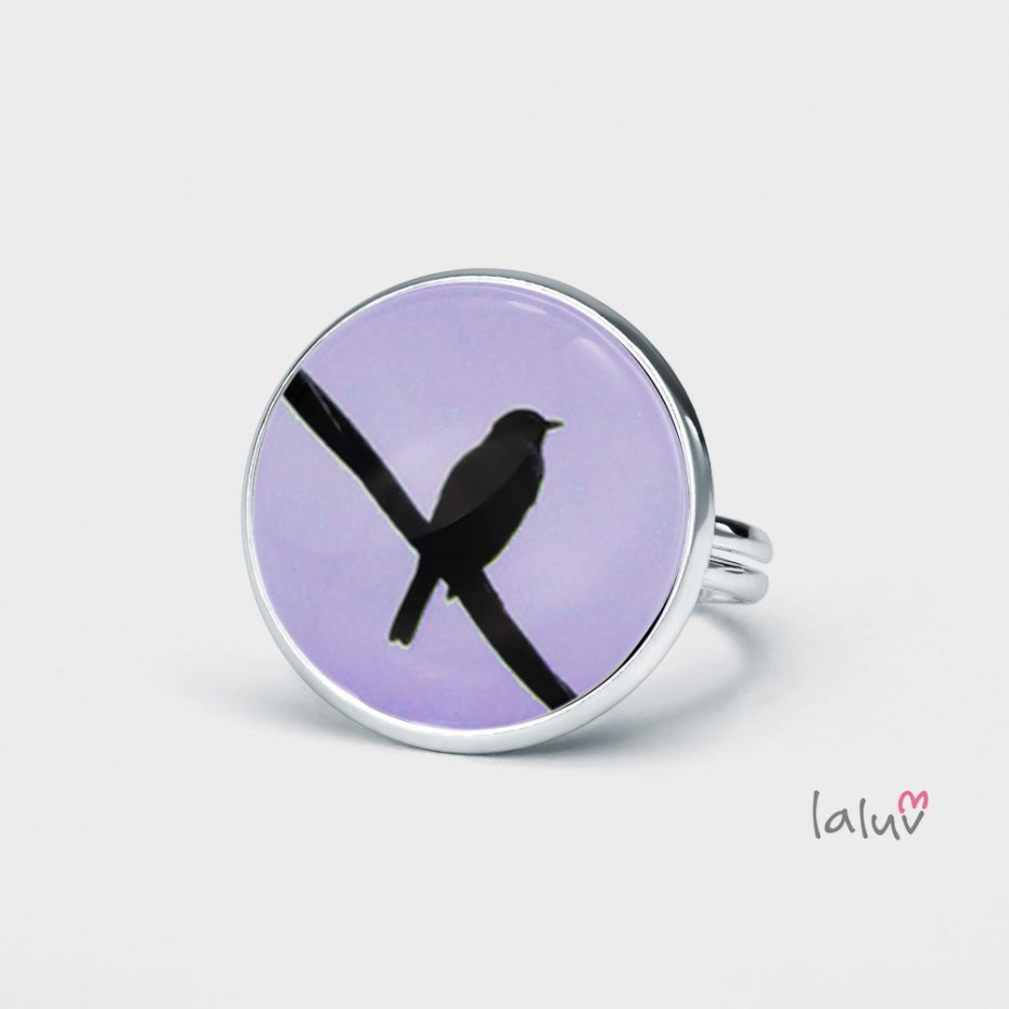 Ręcznie robiony pierścionek z wysokiej jakości grafiką zamkniętą pod wypukłym szkiełkiem i oprawioną w bazę w kolorze srebrnym.