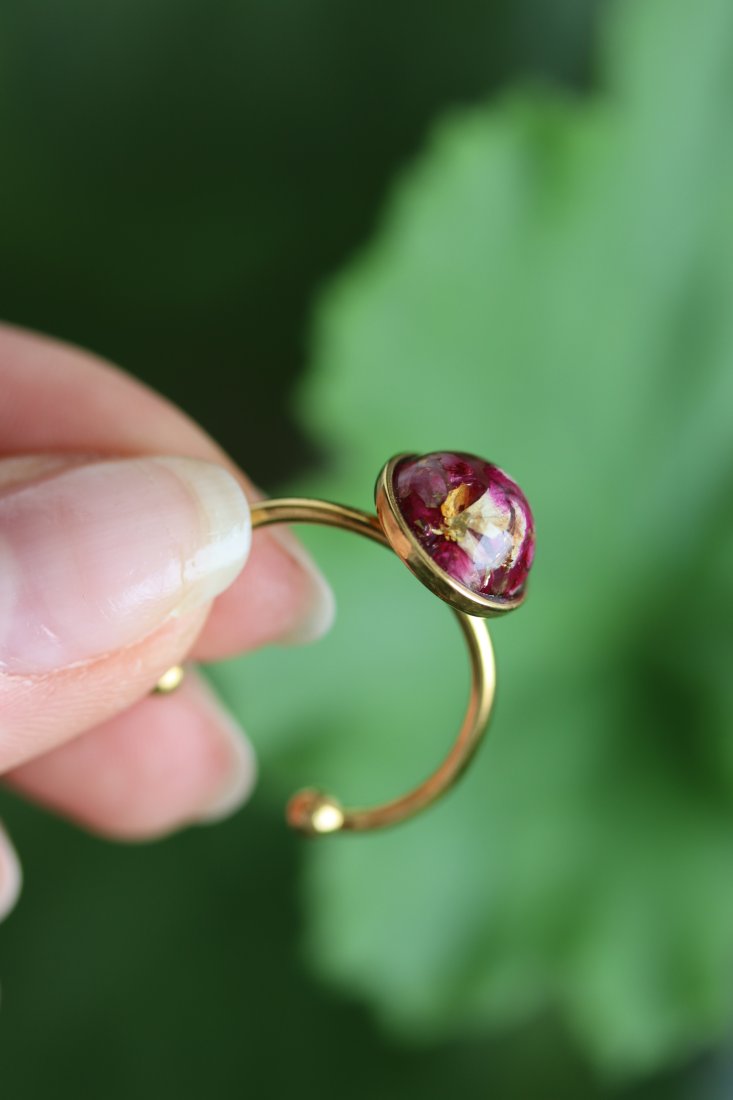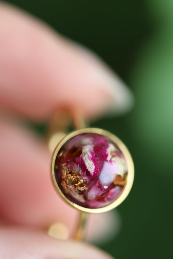 Delikatny pierścionek z zatopionymi prawdziwymi płatkami róż, utrwalonymi w przejrzystej żywicy epoksydowej. Intensywny odcień różu w połączeniu ze złocistymi drobinkami tworzy romantyczną, kobiecą kompozycję pełną ciepła i subtelnego blasku.