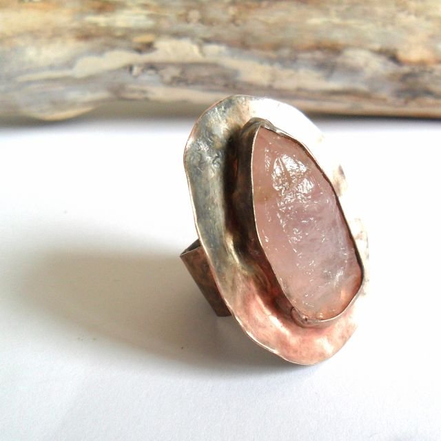 Pierscionek z różowym,surowym kwarcem.Miedz,patynowana na stare srebro i złoto cyna,bryłka kwarcu.Wysokość tarczy 3,8cm,gruba,regulowana obrączka.Polecam.