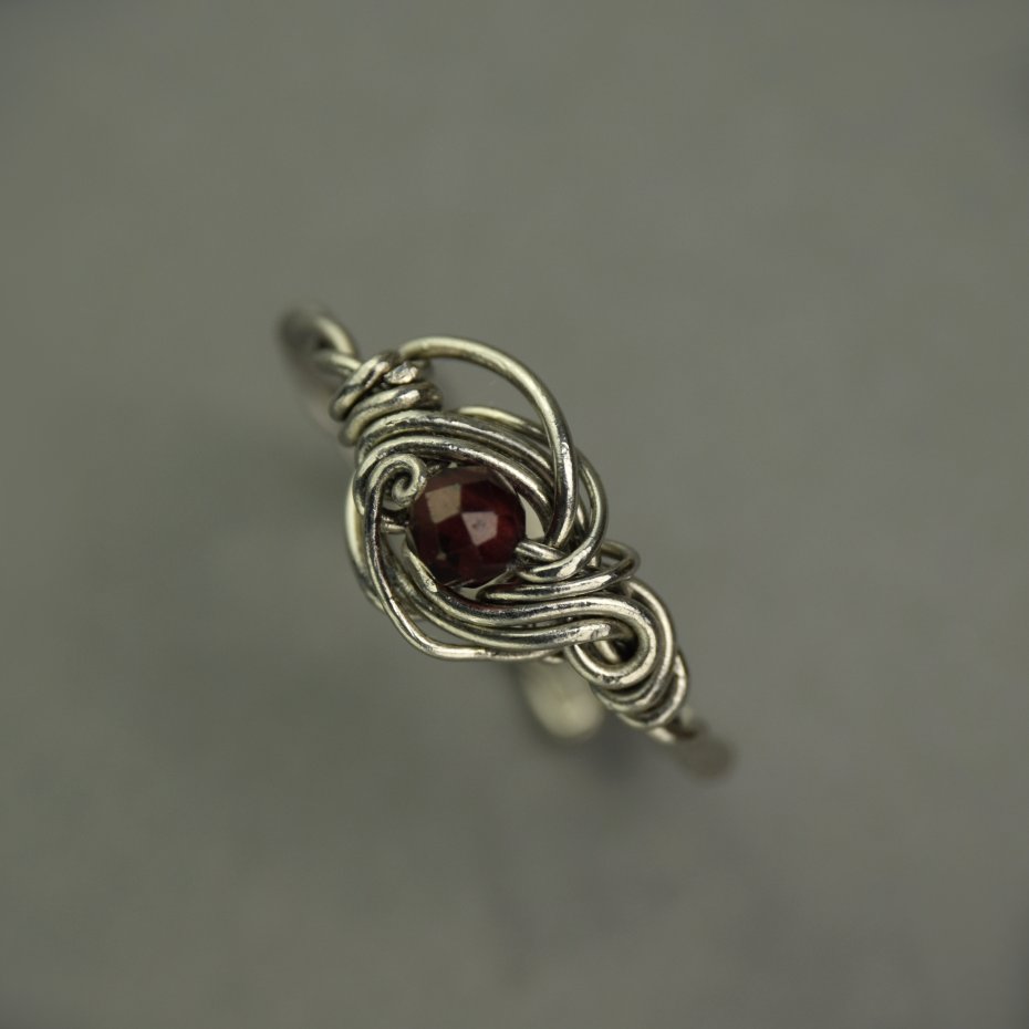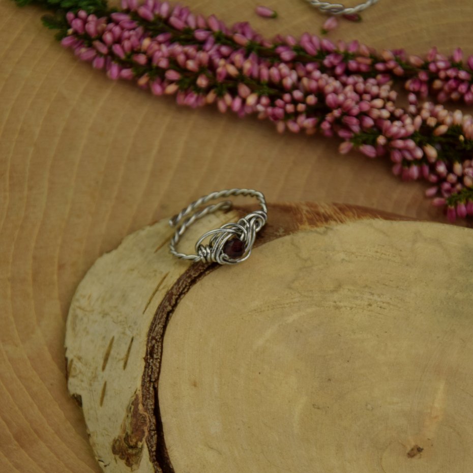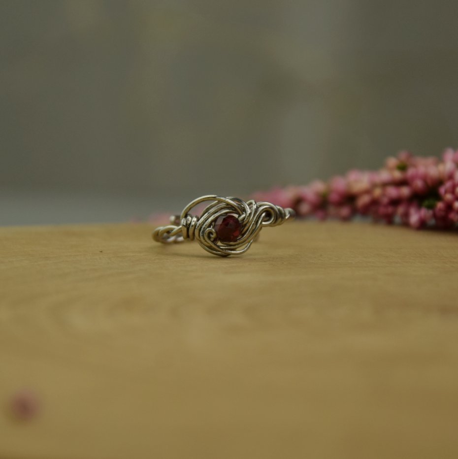 Subtelny pierścionek z granatem, wykonany w całości ręcznie techniką wire wrapping. Pierścionek wykonałam z drutów ze stali chirurgicznej.