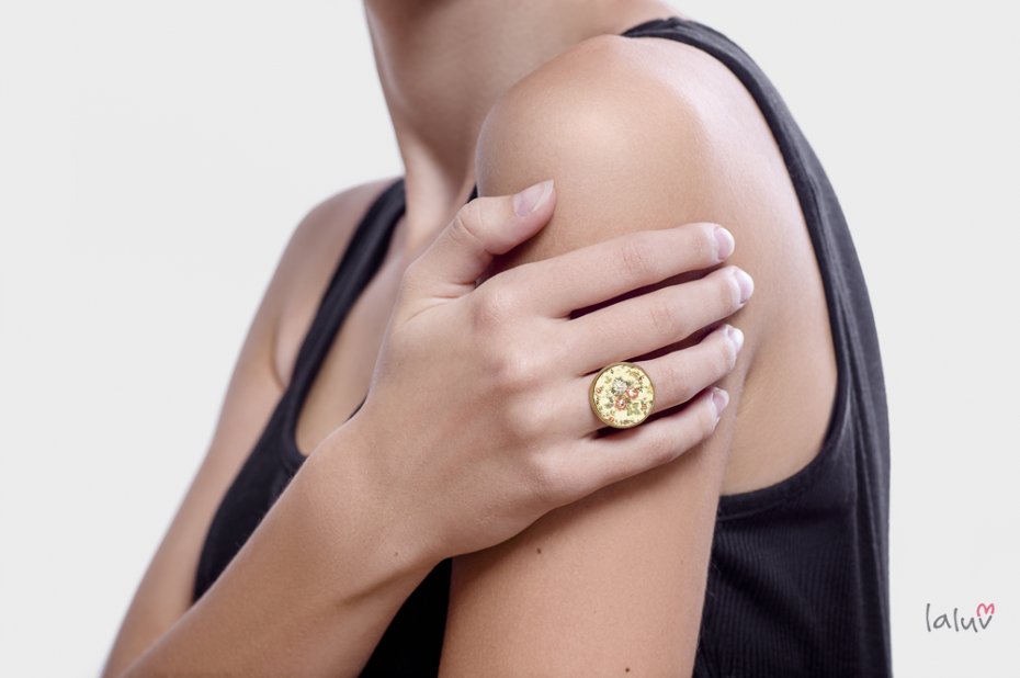 Ręcznie robiony pierścionek z wysokiej jakości grafiką zamkniętą pod wypukłym szkiełkiem i oprawioną w bazę w kolorze antycznego złota.
