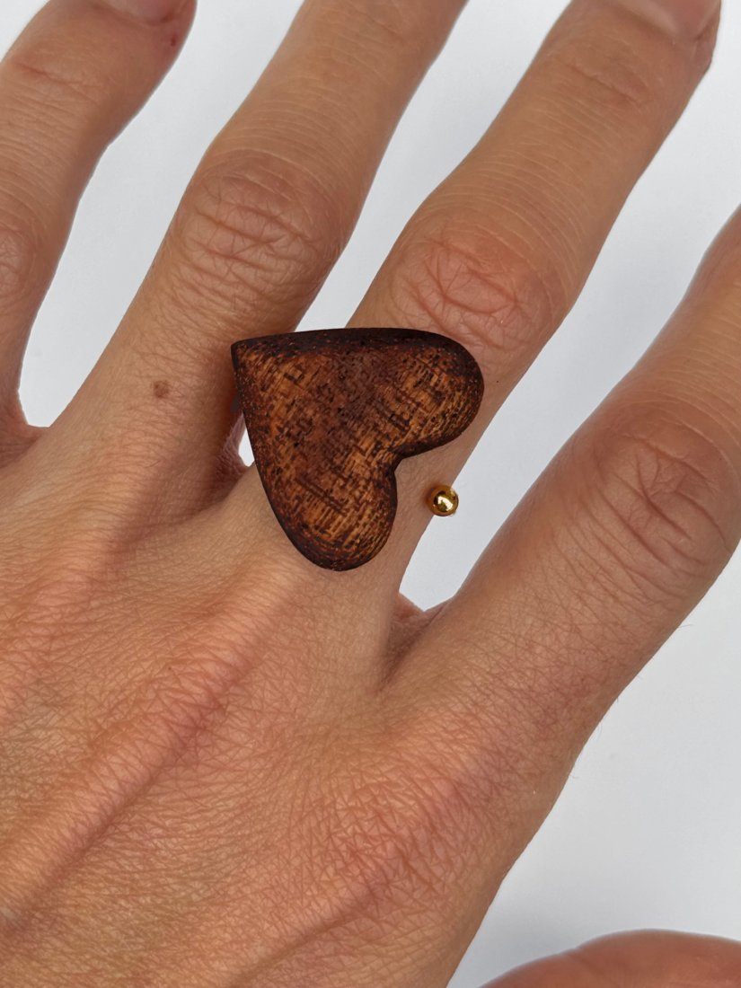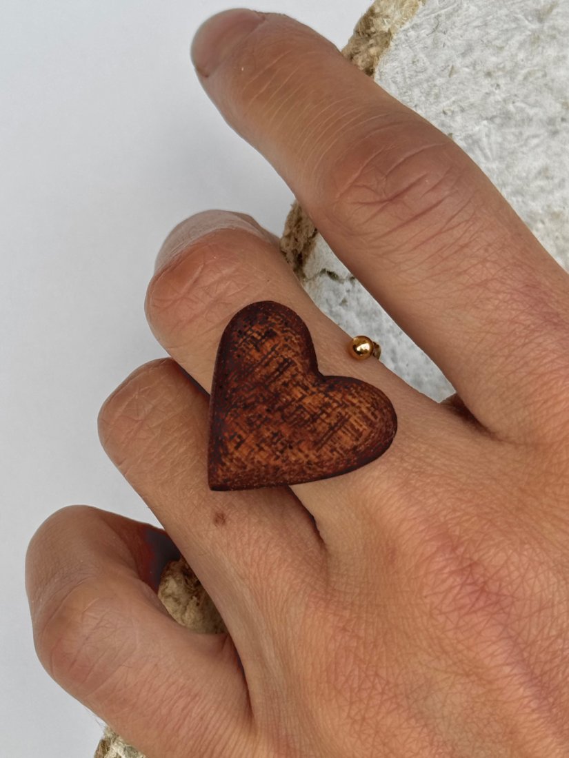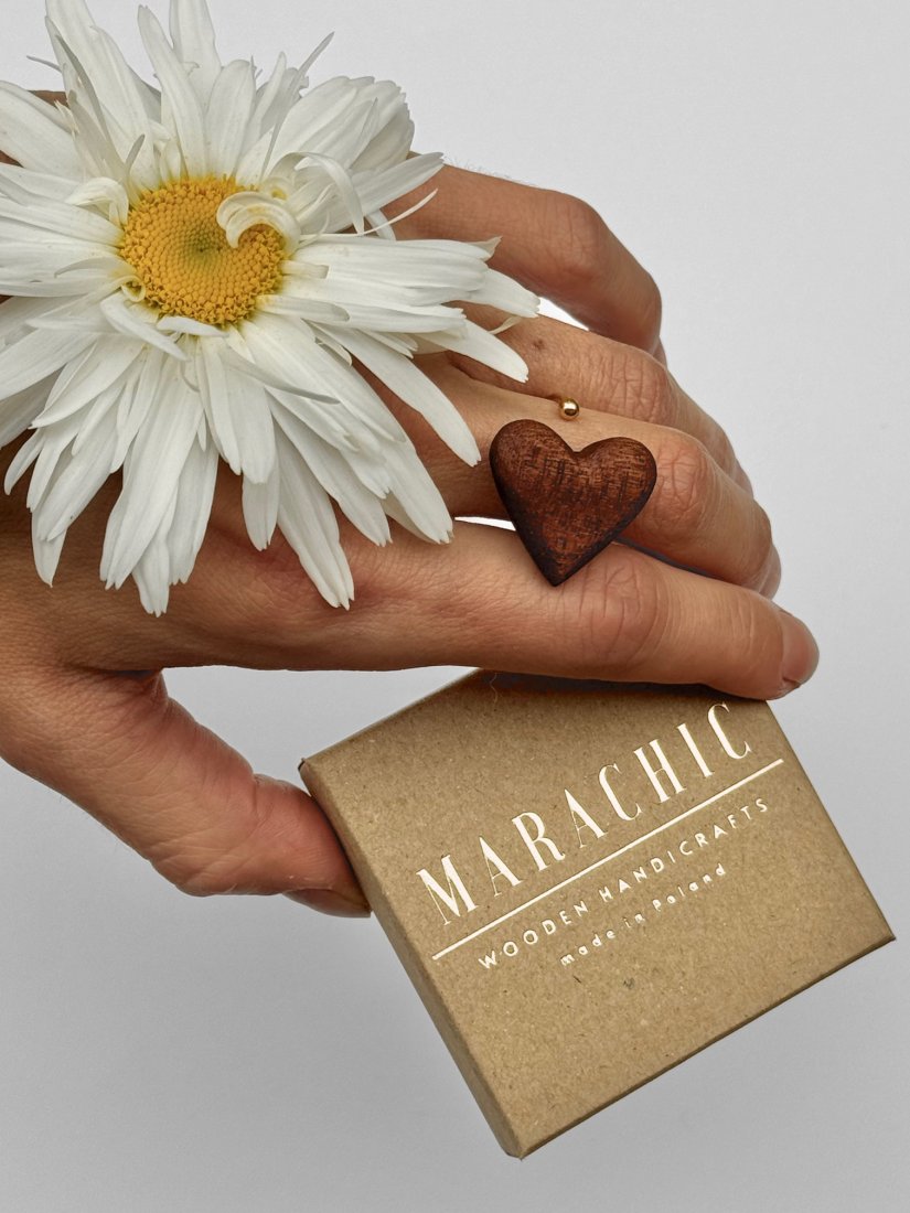 Na delikatną regulowaną obrączkę nasadzone zostało drewniane serce, wykonane z drewna sapeli, które dodaje całości naturalnego uroku i oryginalności.