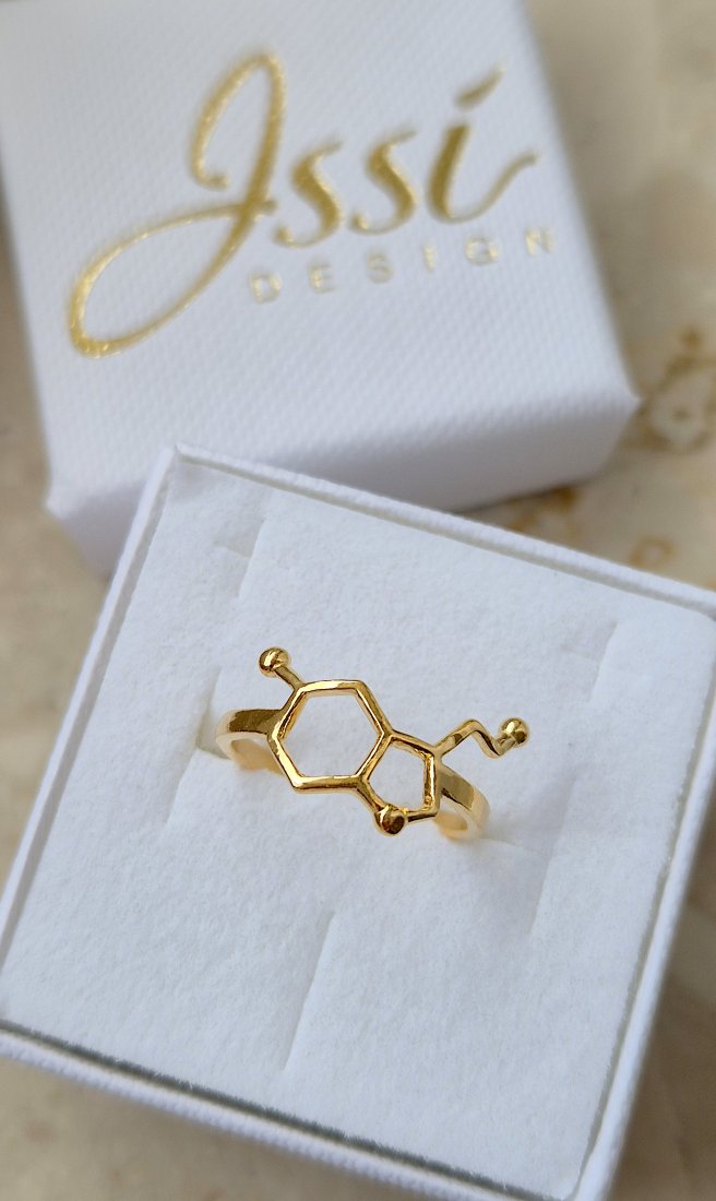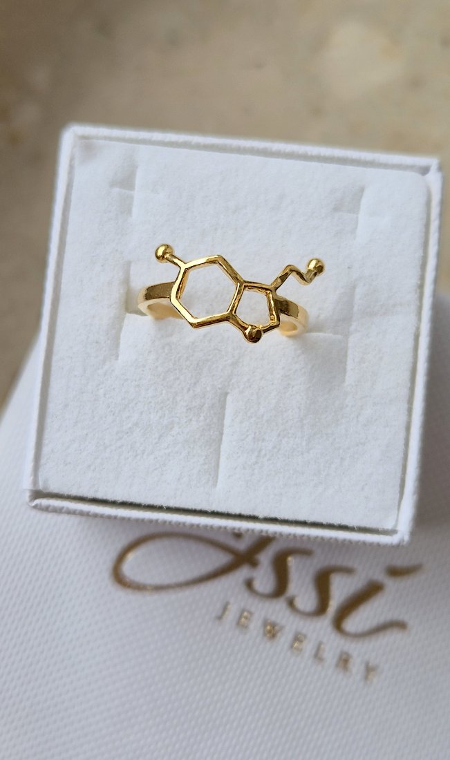 Delikatny pierścionek ze wzorem strukturalnym serotoniny, wykonany ze srebra próby 925 pokrytego 24 KT złotem.