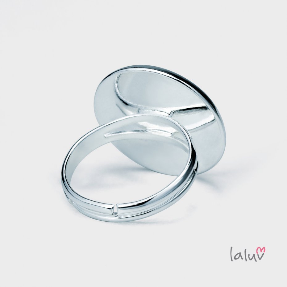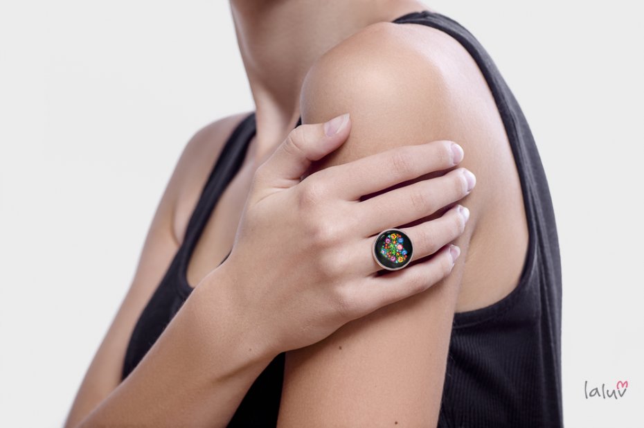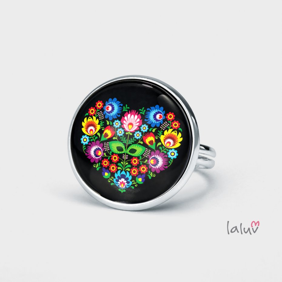 Ręcznie robiony pierścionek z wysokiej jakości grafiką zamkniętą pod wypukłym szkiełkiem i oprawioną w bazę w kolorze srebrnym.