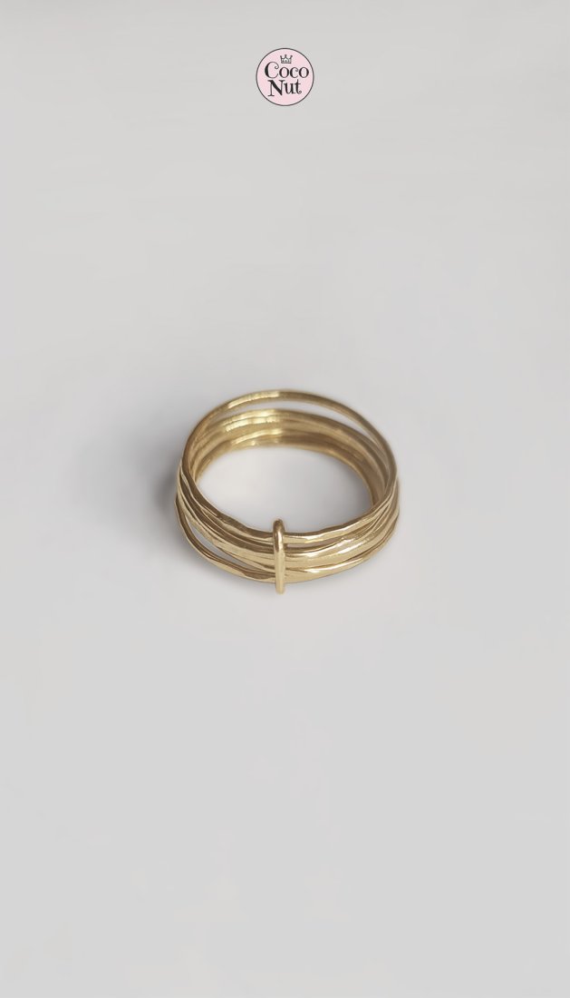Komplet 5 młotkowanych (nierównych) obrączek ze srebra (srebro złocone = pokryte cienką warstwą złota) o szerokości ok. 1 mm, środkowa obrączka 2mm. Obrączki połączone są opaską o szerokości 1 mm.