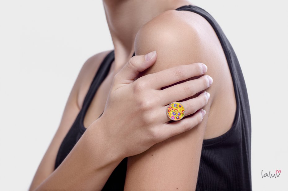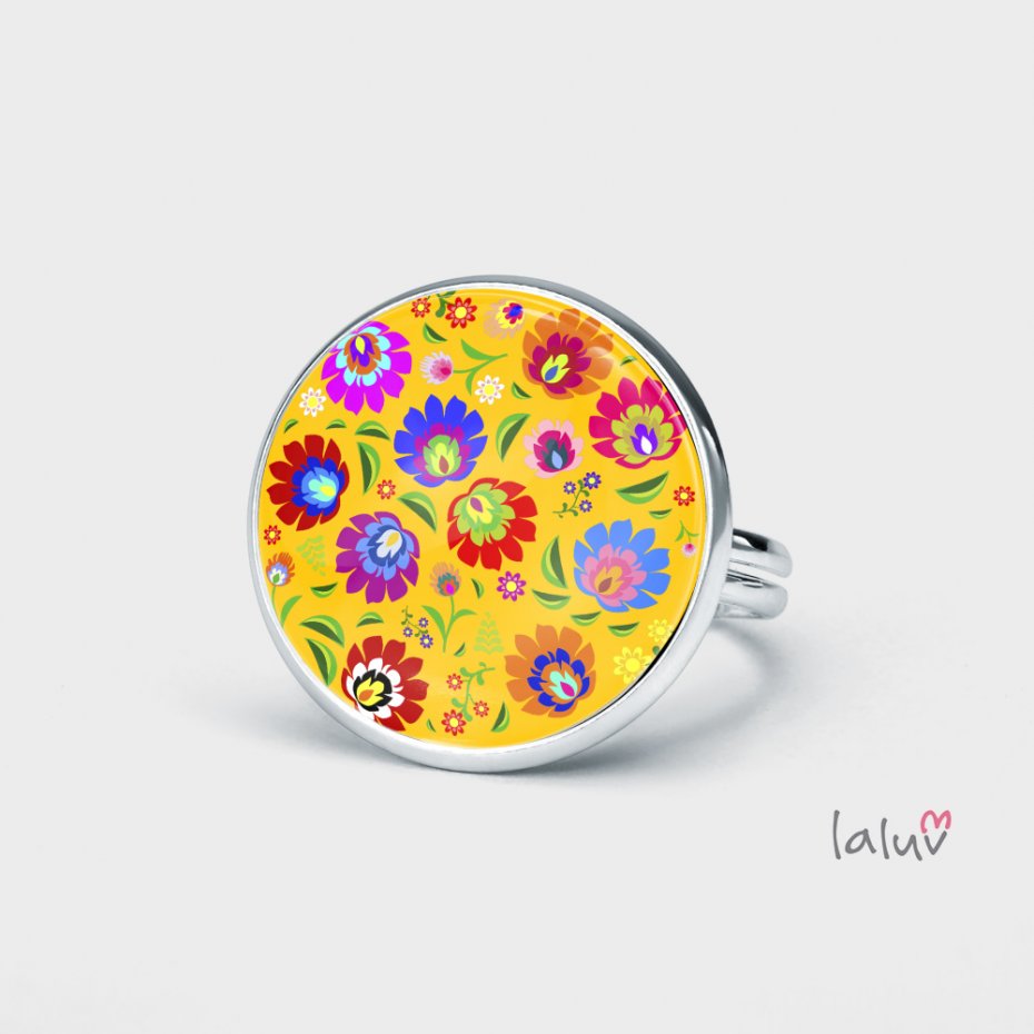 Ręcznie robiony pierścionek z wysokiej jakości grafiką zamkniętą pod wypukłym szkiełkiem i oprawioną w bazę w kolorze srebrnym.