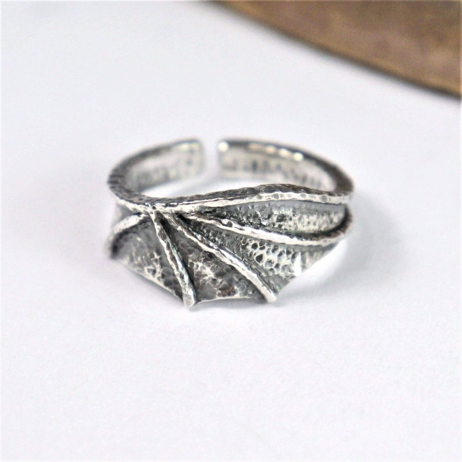 Stylowy pierścionek w kształcie skrzydła smoczego oplatającego palec. Niesztampowy dodatek do każdej stylizacji, dla kobiet lubiących podkreślać swoją indywidualność. Został wykonany w 100% ręcznie ze srebra próby 925. Dla lekko mrocznego charakteru pierścionek został przyciemniony oksydą. Jest to pierścionek otwarty, który daje możliwość regulacji o pół rozmiaru w dół lub w górę (przykładowo, pierścionek w rozmiarze 13 da się regulować do rozmiaru 12,5 oraz 13,5). Pierścionek wykonywany jest na zamówienie - proszę o podanie rozmiaru pierścionka lub obwodu palca w wiadomości do zamówienia.