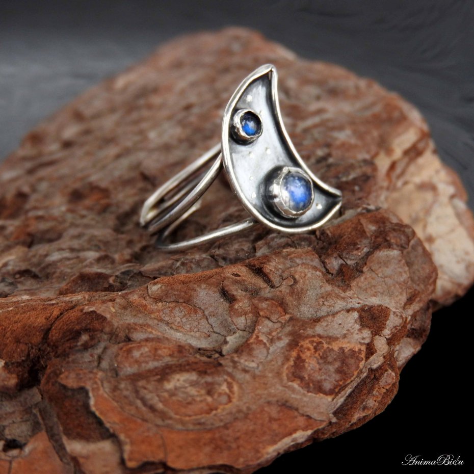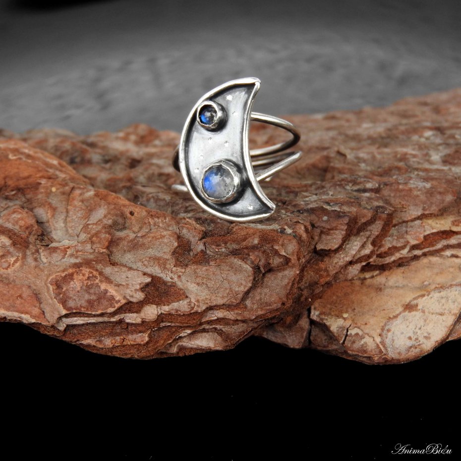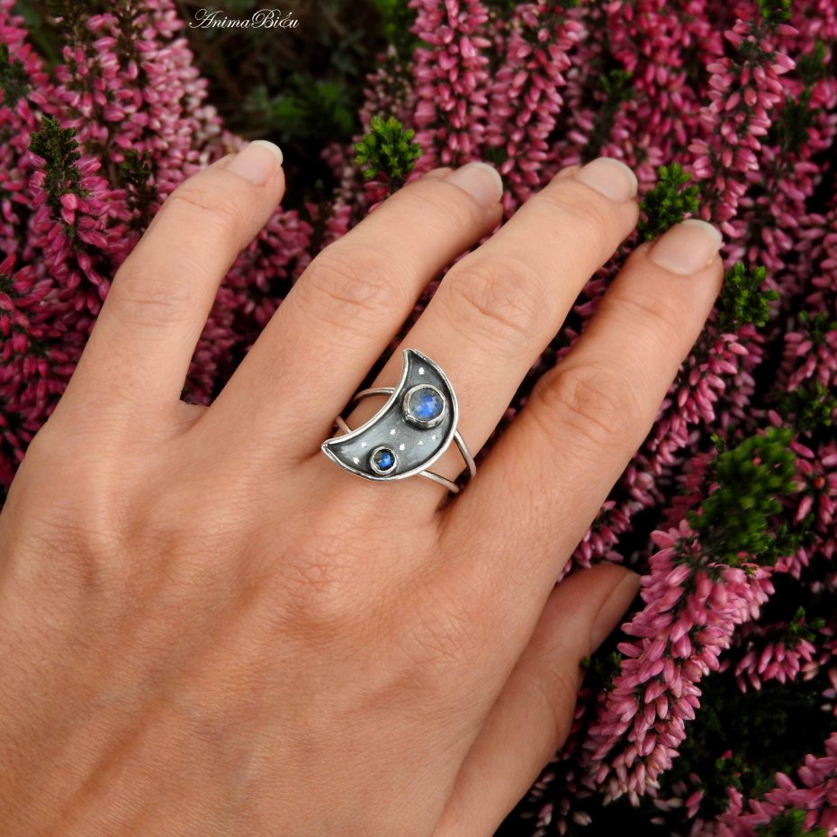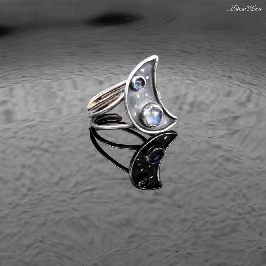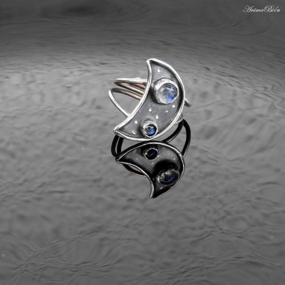 Pierścionek srebrny z kamieniem księżycowym i labradorytem. Wykonany od podstaw ręcznie pierścionek powstał ze srebra próby 925 i 999. Jego koronę stanowi półksiężyc, w którym umieściłam kamień księżycowy i malutki labradoryt. Tło przyciemniłam, by wyglądało jak niebo nocą, resztę wypolerowałam na lustro. Półksiężyc ma wymiary 20 na 10 mm i został umieszczony na podwójnej, regulowanej obrączce. Przy zakupie proszę o informacje jaki rozmiar mam ustawić. Waga: 3,4g. Technika wykonania: lutowanie, młotkowanie.