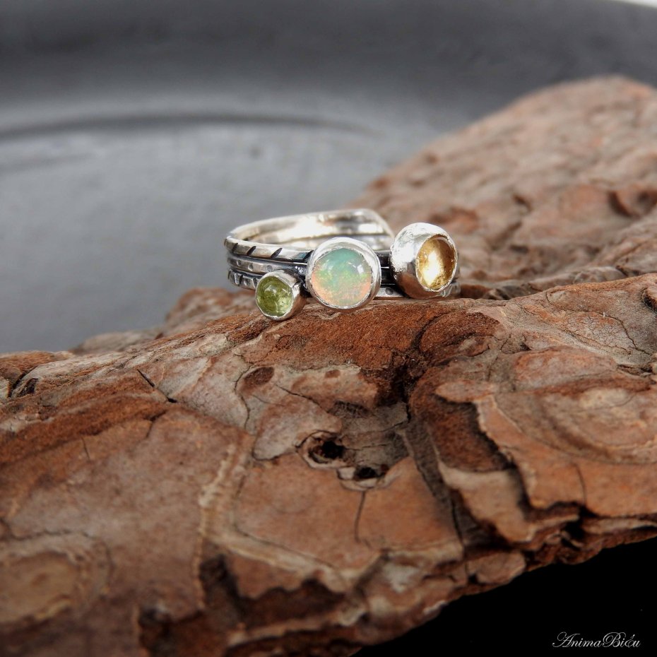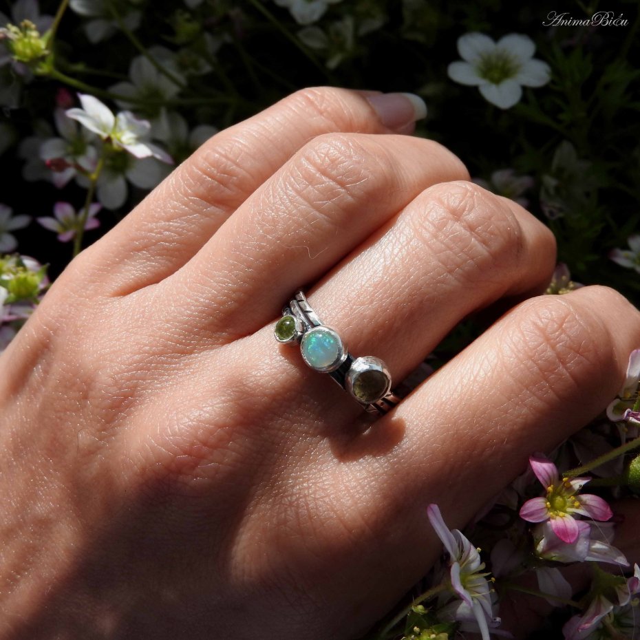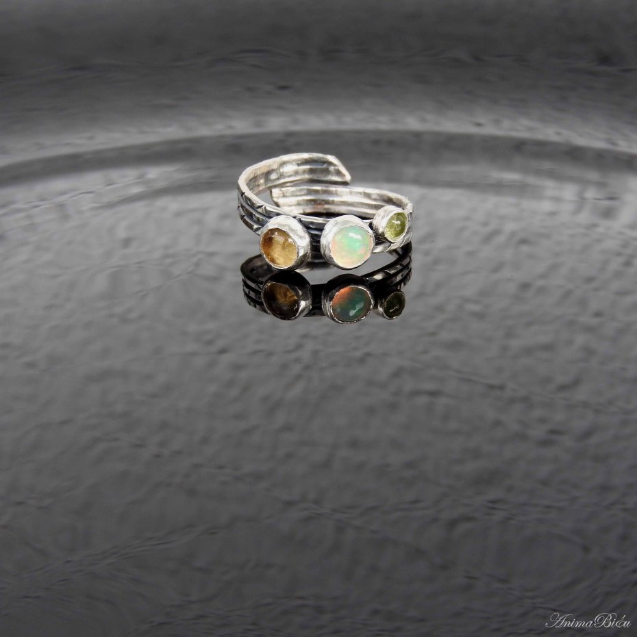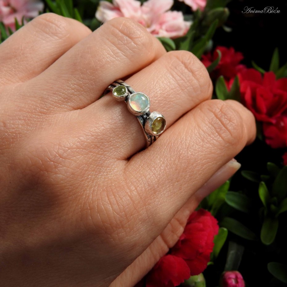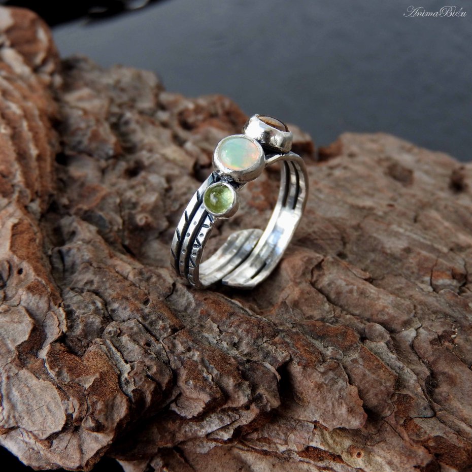 Tagi: #pierścionek regulowany, #potrójny z opalem, #srebrny z oliwinem, #z trzema minerałami