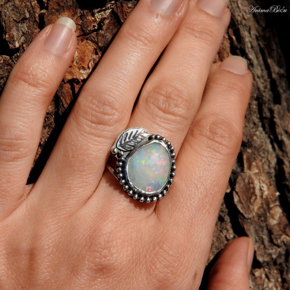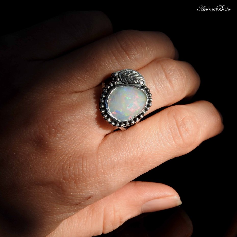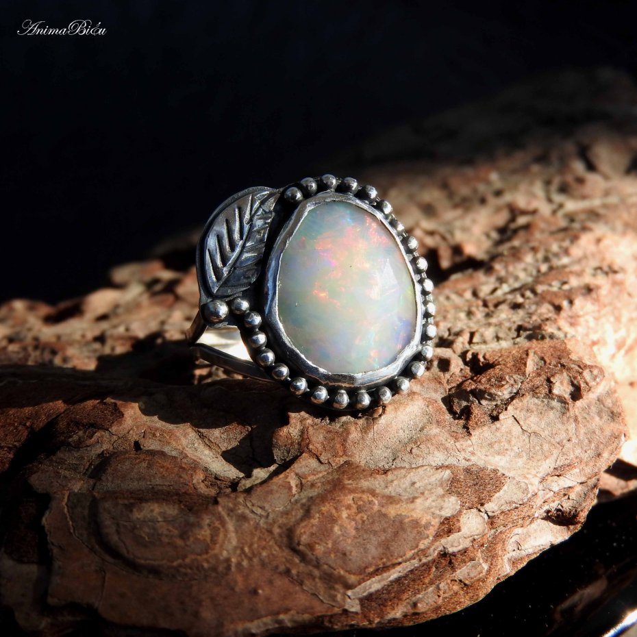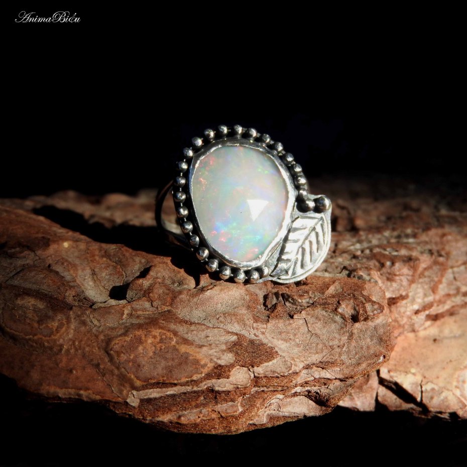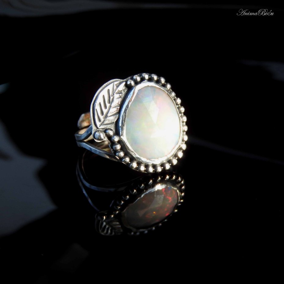 Pierścionek srebrny z opalem etiopskim. Wykonany od podstaw ręcznie pierścionek powstał ze srebra próby 925 i 999, które dla podkreślenia zdobień przyciemniłam i wypolerowałam. Sercem pierścionka jest przepiękny, fasetowany opal etiopski o mlecznej barwie opalizującej ferią barw. Otoczyłam go rzędem srebrnych kuleczek i ręcznie rzeźbionym listkiem. Korona ma wymiary 19 na 20 milimetrów, osadziłam ją na podwójnej, regulowanej obrączce. Przy zakupie proszę o podanie informacji jaki rozmiar mam ustawić. Waga pierścionka: 4,5 gramów. Technika wykonania: lutowanie, młotkowanie.