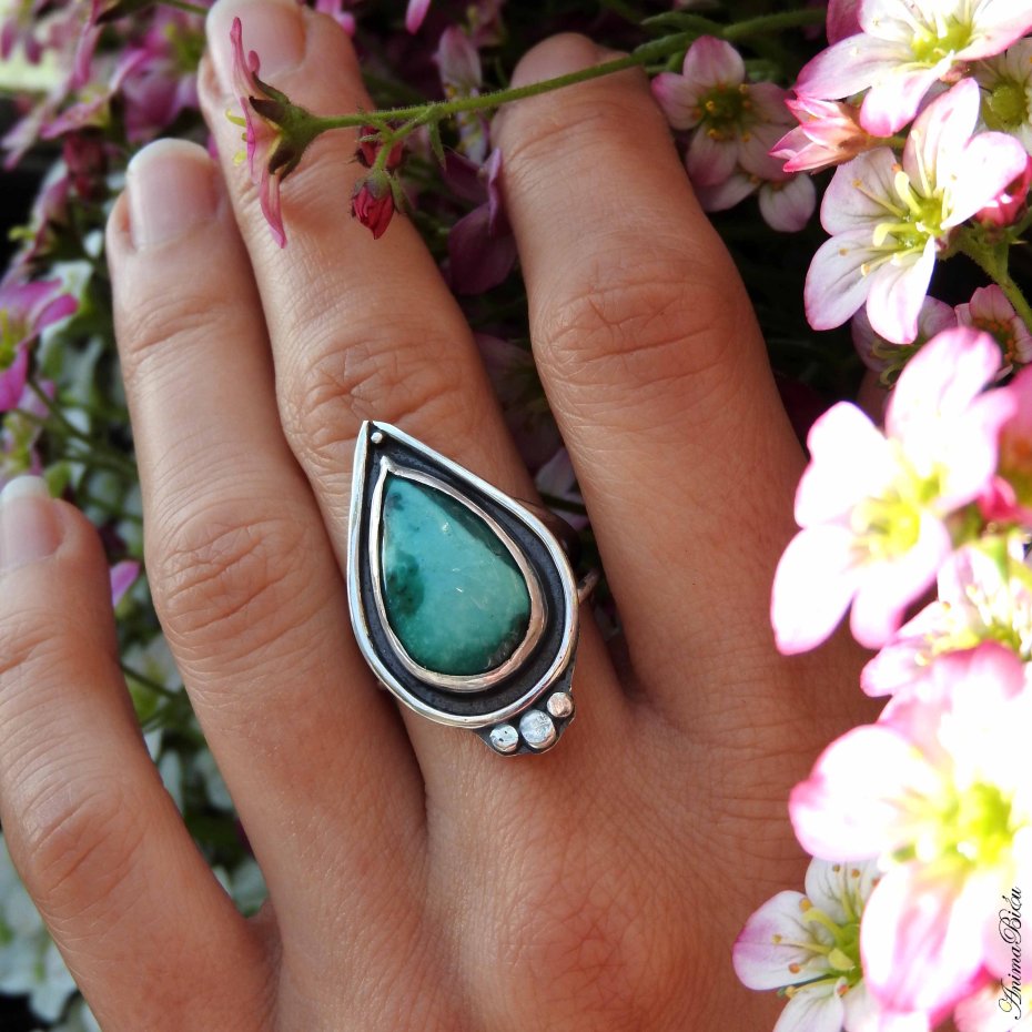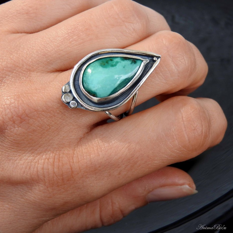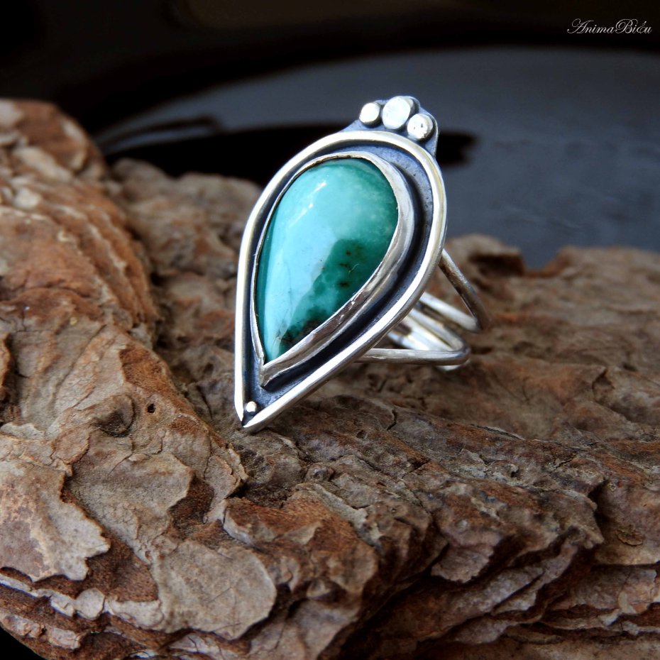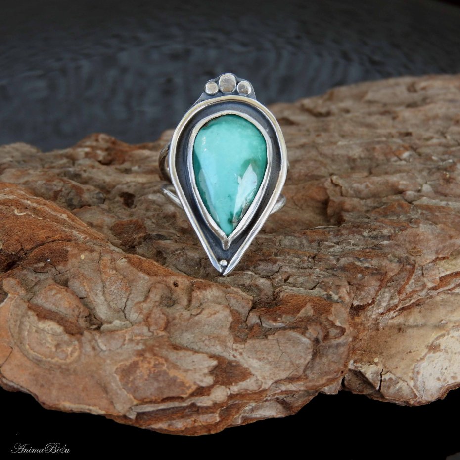 Pierścionek srebrny z turkusem tybetańskim. Pierścionek wykonałam od podstaw ręcznie ze srebra próby 925 i 999, które dla podkreślenia zdobień przyciemniłam i wypolerowałam na połysk. Sercem pierścionka jest bardzo urodziwy okaz turkusu tybetańskiego w kształcie dużej łezki. Koronę osadziłam na podwójnej, regulowanej obrączce. Przy zakupie proszę o podanie informacji jaki rozmiar mam ustawić. Waga pierścionka: 6,4 g. Wymiary korony: 30 na 18 mm. Technika wykonania: lutowanie, młotkowanie.