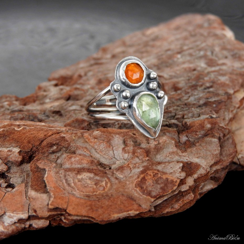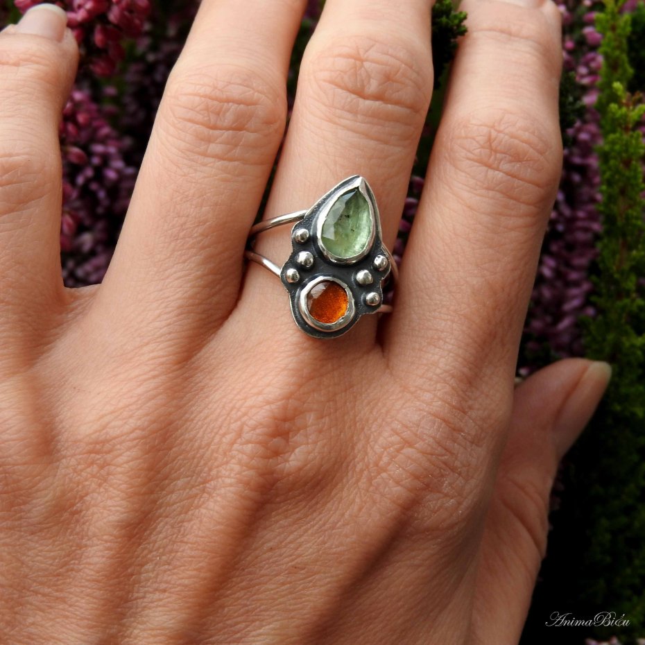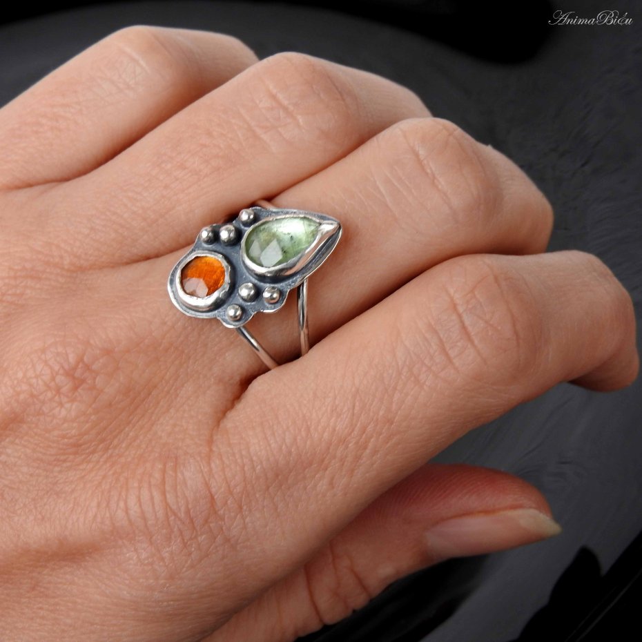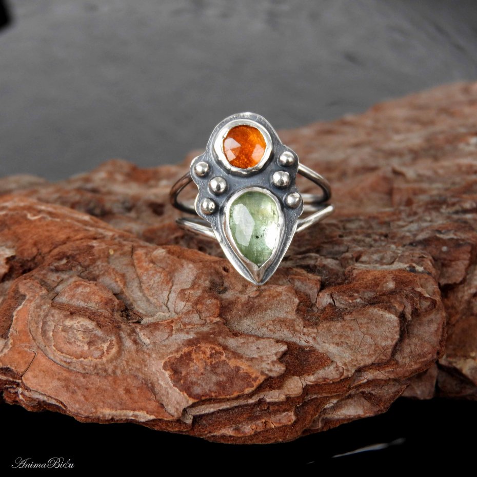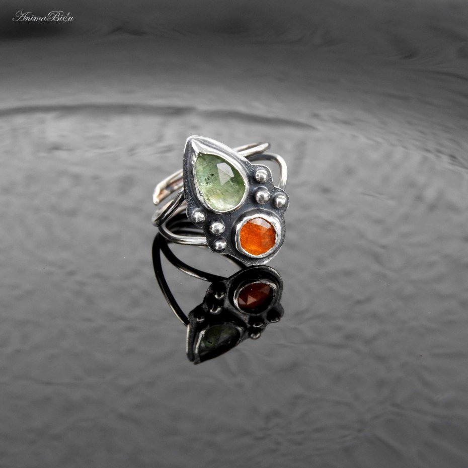 Pierścionek srebrny z zielonym i pomarańczowym kyanitem. Wykonany od podstaw ręcznie pierścionek powstał ze srebra próby 925 i 999, które przyciemniłam i wypolerowałam. Sercem pierścionka są dwa kyanity o fasetowanej powierzchni. Zielona łezka w kolorze jasno zielonym i okrągły pomarańczowy. Kamienie mają naturalnie występujące inkluzje i spękania w środku. Koronę osadziłam na podwójnej regulowanej obrączce. Przy zakupie proszę o podanie rozmiaru jaki mam ustawić. Waga pierścionka: 3,7 gramów. Wymiary korony: 20 na 12 mm. Technika wykonania: lutowanie, młotkowanie.