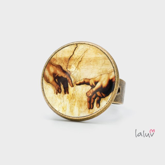 Ręcznie robiony pierścionek z wysokiej jakości grafiką zamkniętą pod wypukłym szkiełkiem i oprawioną w bazę w kolorze antycznego złota.