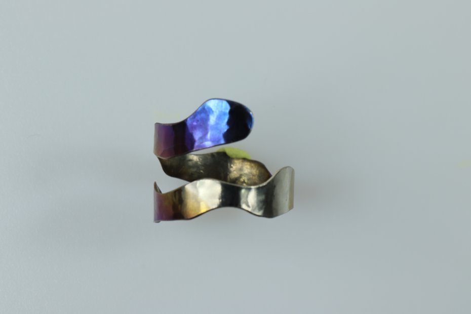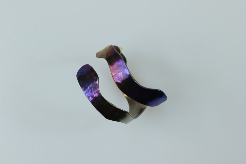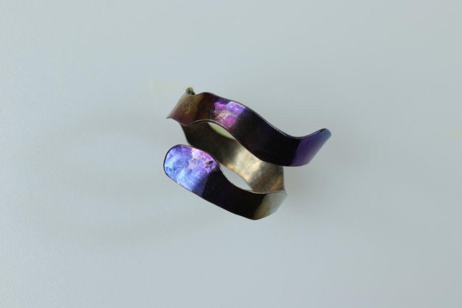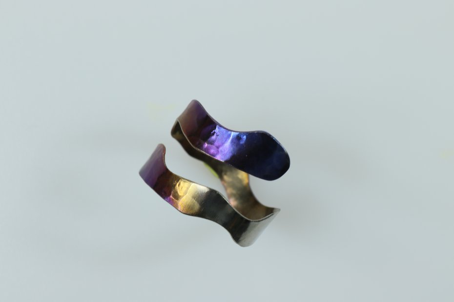 Ręcznie wykonany pierścionek z tytanu Grade I. Tytan anodowany i repusowany. Pierścionek jest bardzo lekki i hipoalergiczny. Szerokość pierścionka 1.5 cm a średnica 1.8 cm (regulowana).
