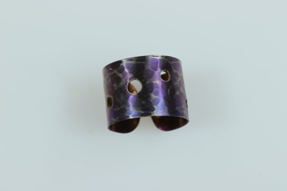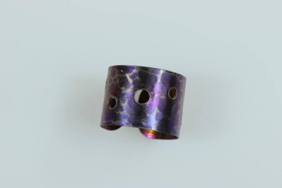 Ręcznie wykonany pierścionek z tytanu Grade I. Tytan anodowany i repusowany. Młotkowany i przecierany. Pierścionek jest bardzo lekki i hipoalergiczny. Szerokość pierścionka 1,5 cm a średnica 1,9 cm (regulowana)