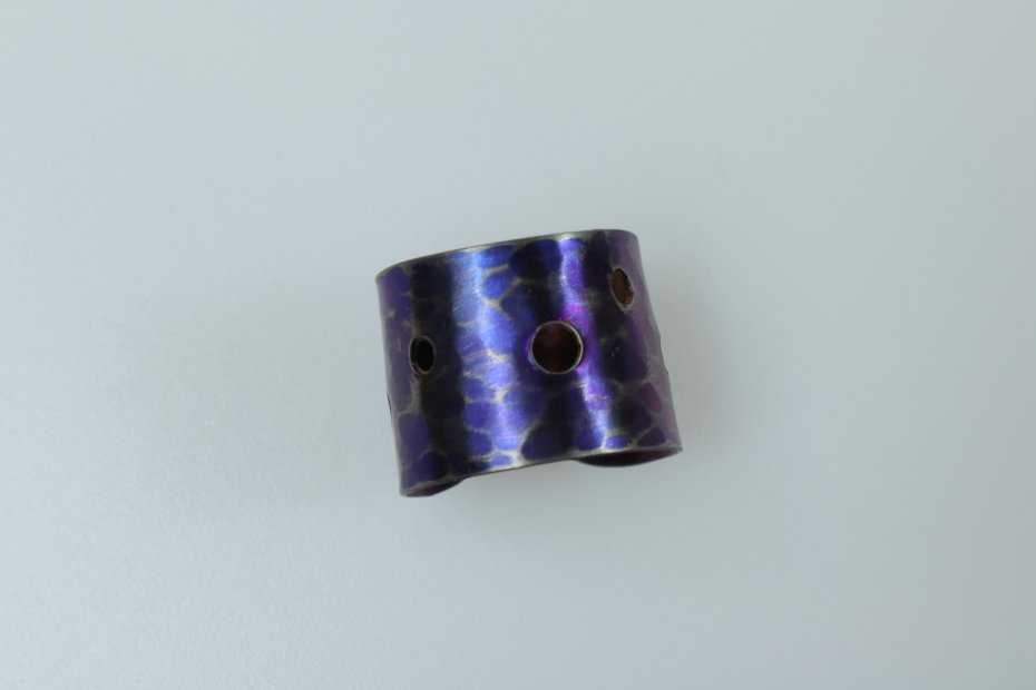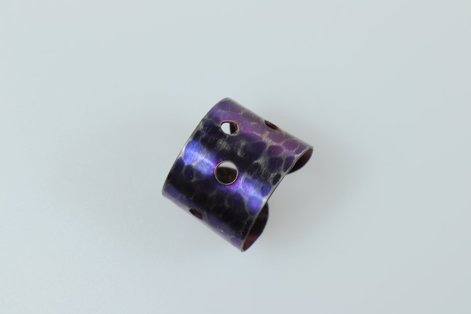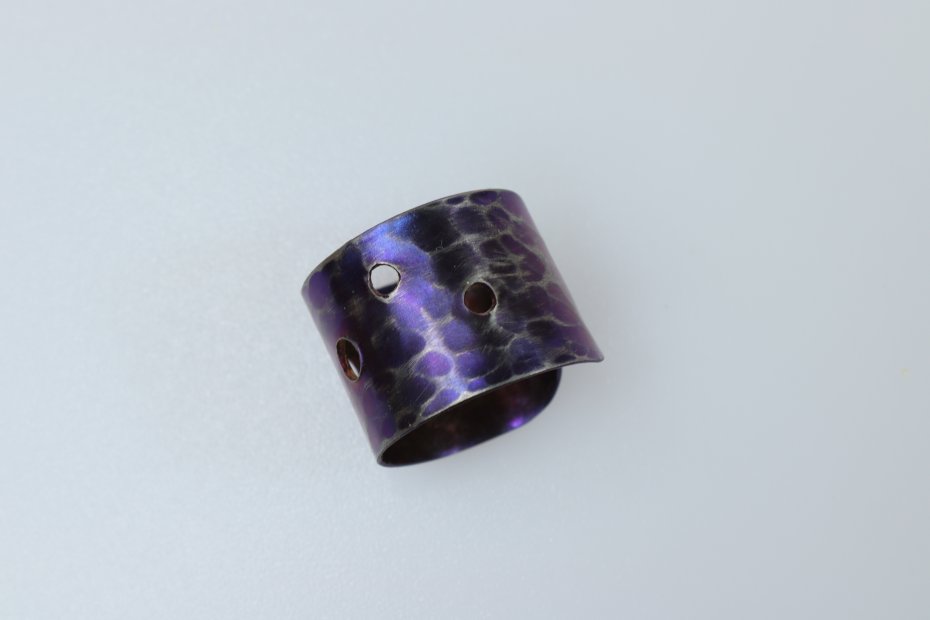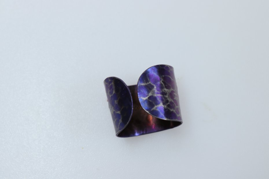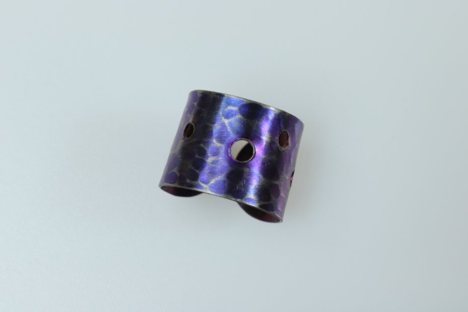 Ręcznie wykonany pierścionek z tytanu Grade I. Tytan anodowany i repusowany. Młotkowany i przecierany. Pierścionek jest bardzo lekki i hipoalergiczny. Szerokość pierścionka 1,5 cm a średnica 1,9 cm (regulowana)