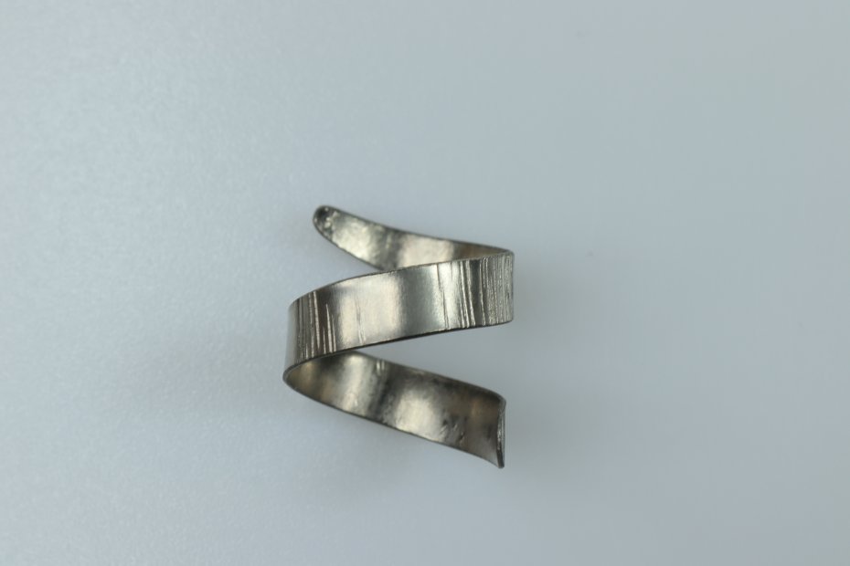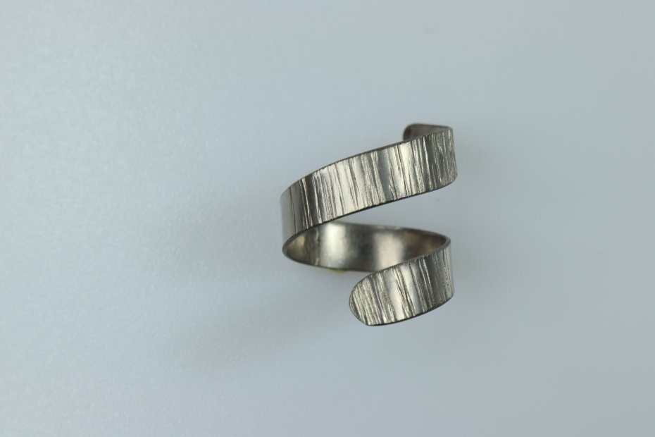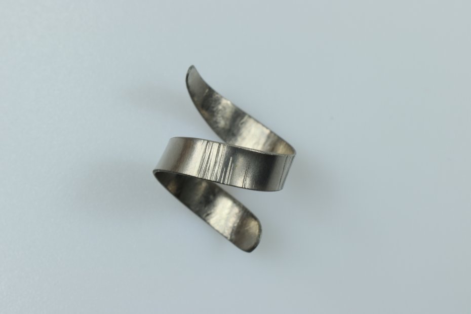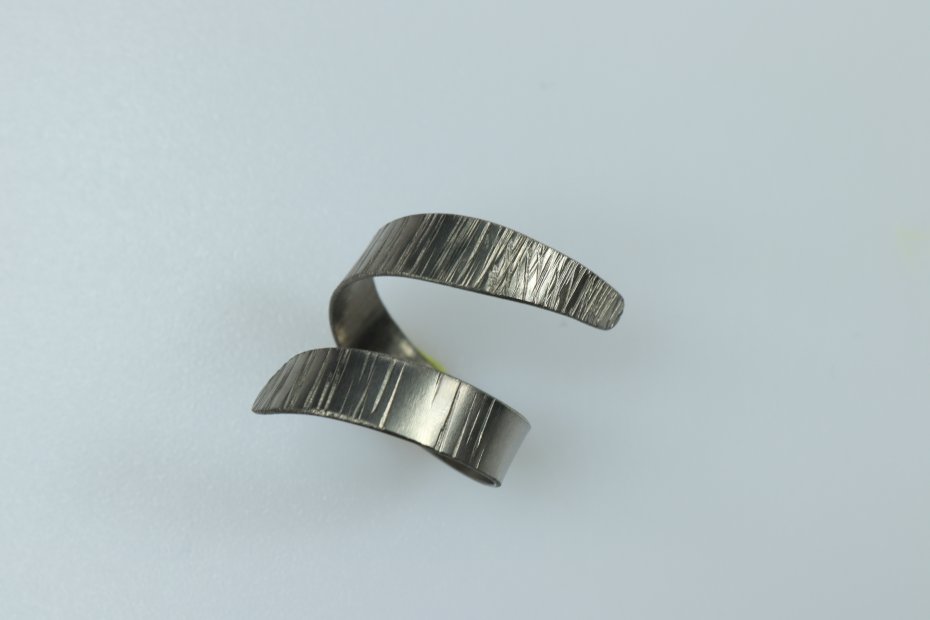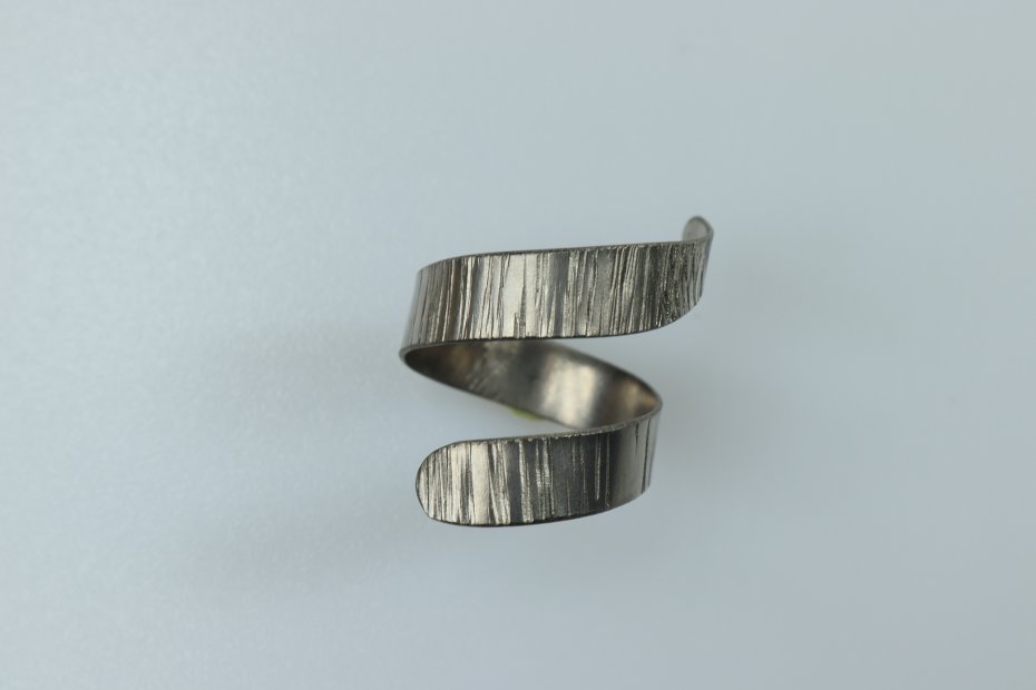 Ręcznie wykonany pierścionek z tytanu Grade I. Tytan szczotkowany. Pierścionek jest bardzo lekki i hipoalergiczny. Szerokość pierścionka 2 cm. Średnica regulowana 1,7 cm.
