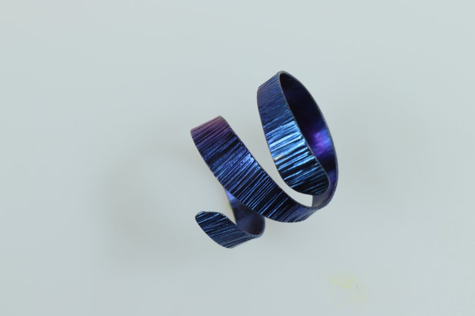 Ręcznie wykonany pierścionek z tytanu Grade I. Tytan anodowany i szczotkowany. Pierścionek jest bardzo lekki (1 g) i hipoalergiczny. Szerokość pierścionka 2 cm a średnica 1.8 cm (regulowana).