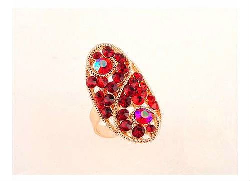 Cudny pierścionek w złotym kolorze, wysadzany kryształkami w trzech odcieniach czerwieni. Bardzo efektownie prezentuje się na palcu.