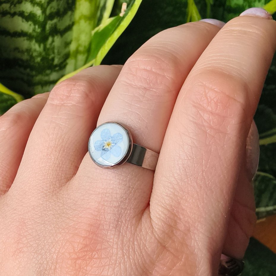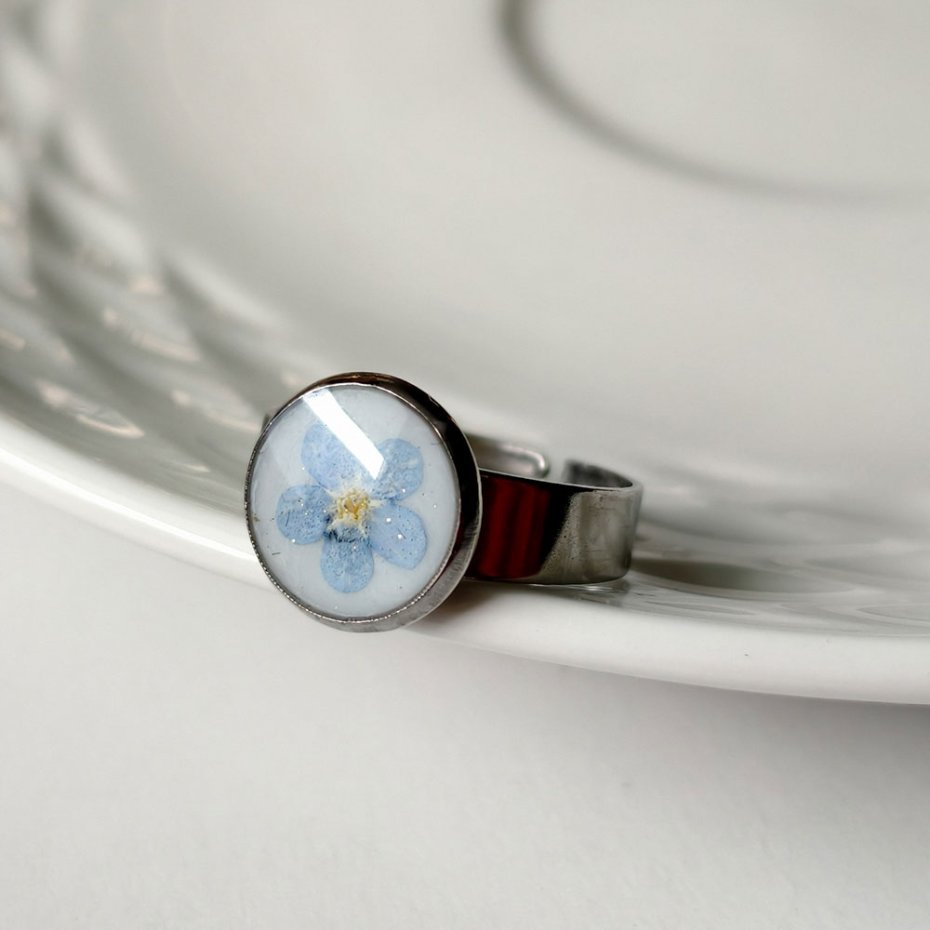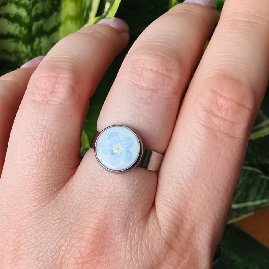Wyjątkowy pierścionek ze stali szlachetnej, stworzony z myślą o osobach, które cenią naturalną i osobistą biżuterię. W jego wnętrzu znajduje się prawdziwa niezapominajka – ręcznie zebrana i starannie suszona, a następnie zatopiona w krystalicznej żywicy. Każdy detal został dopracowany ręcznie, dzięki czemu każdy pierścionek jest niepowtarzalny.