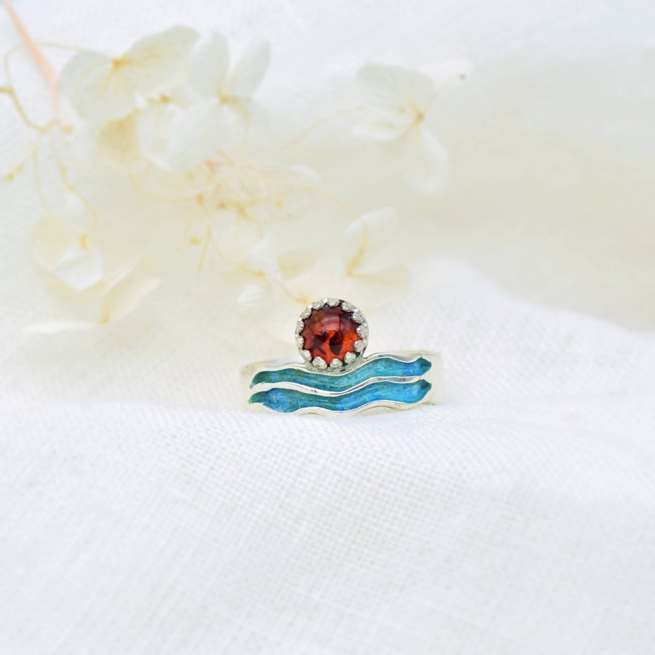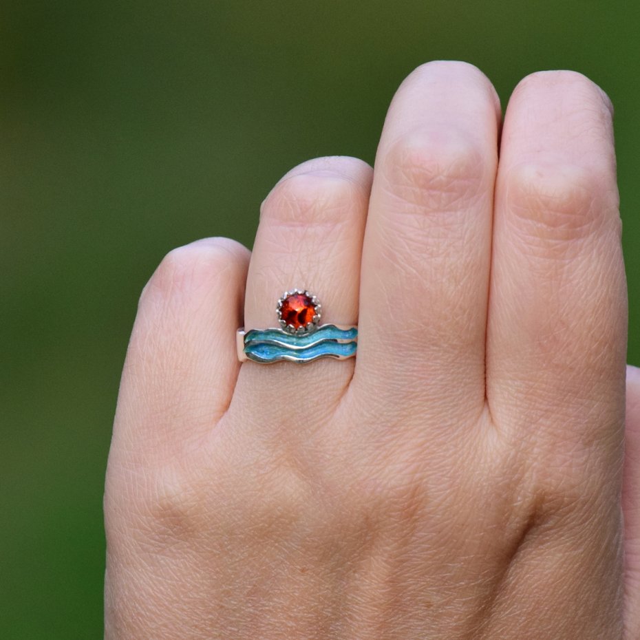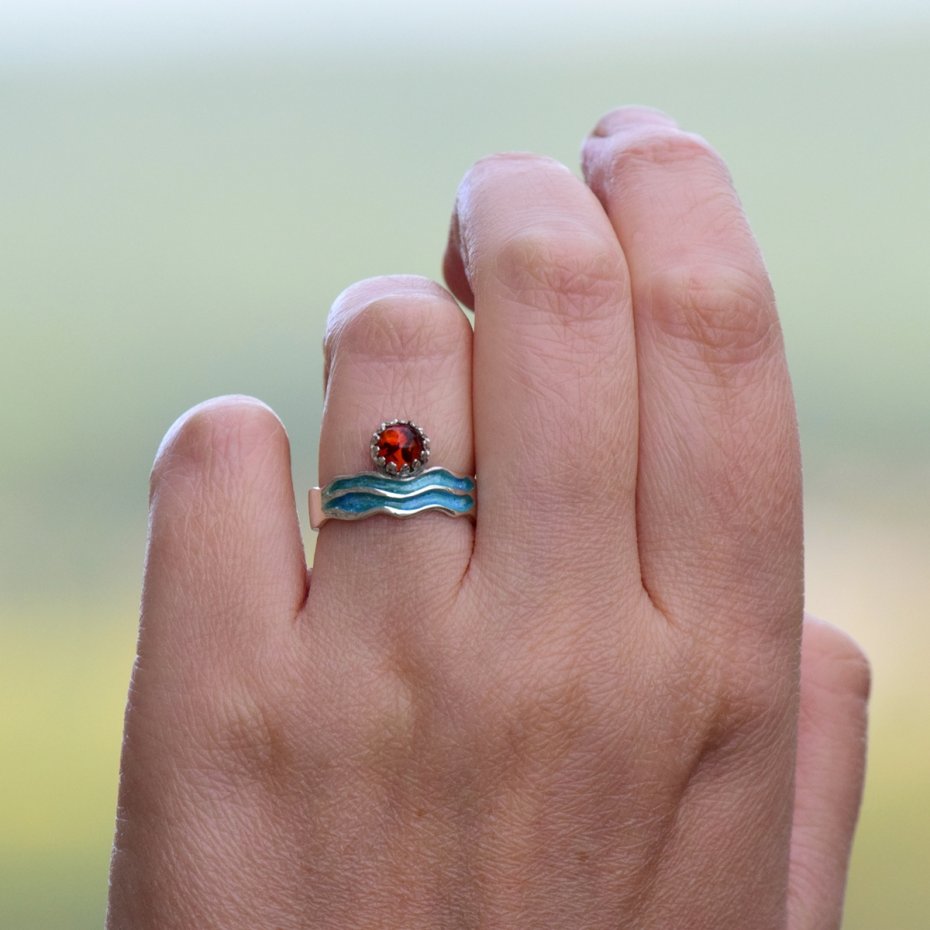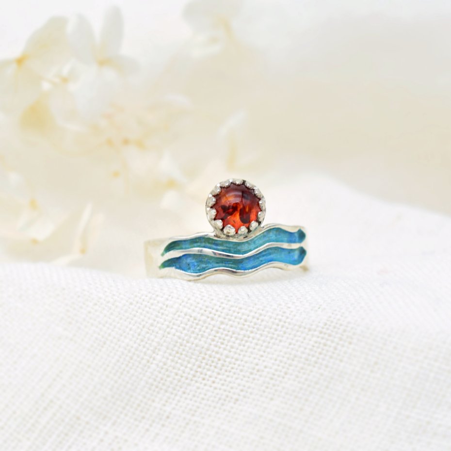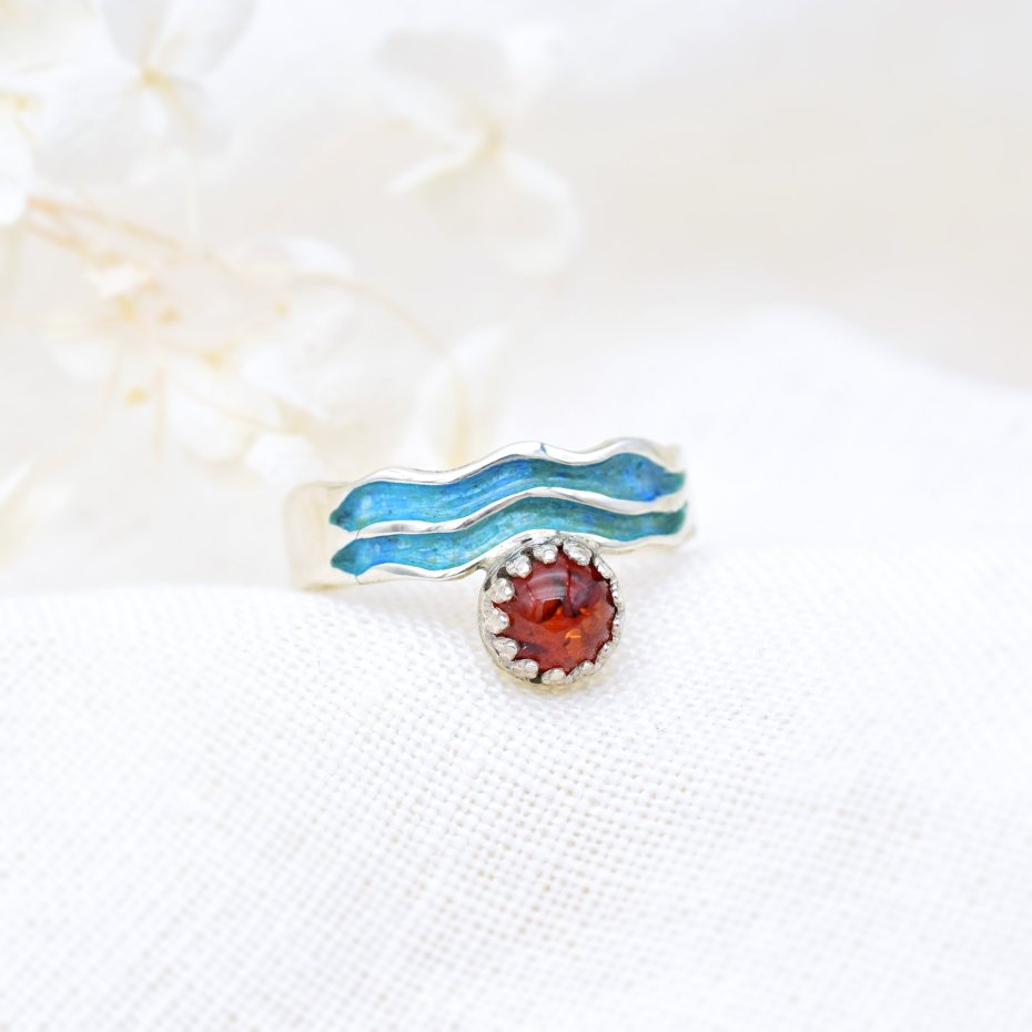 Wyrazisty pierścionek inspirowany morską falą. Przednią część obrączki zdobi ręcznie wykonana dekoracja ze szlachetnej emalii w odcieniach błękitu i zieleni. Nad falującą linią srebra unosi się bursztyn o ciepłej, miodowej barwie - niczym zachodzące słońce nad Bałtykiem.
