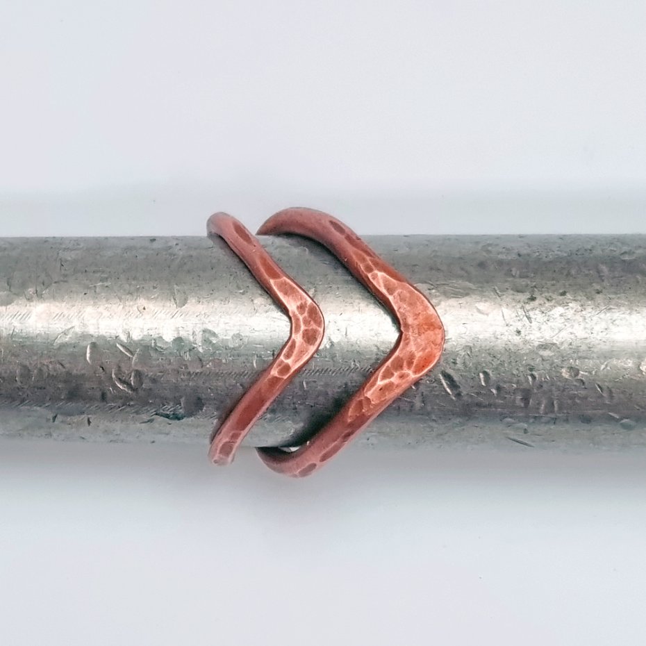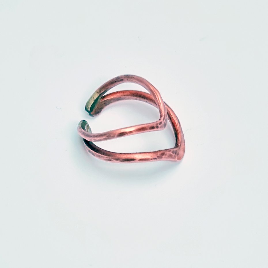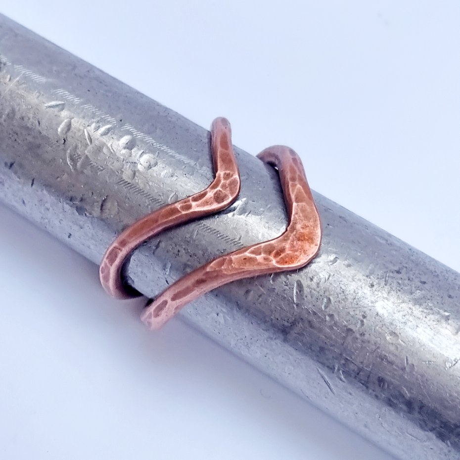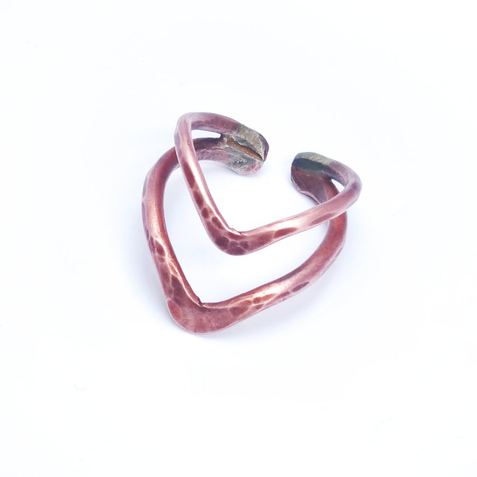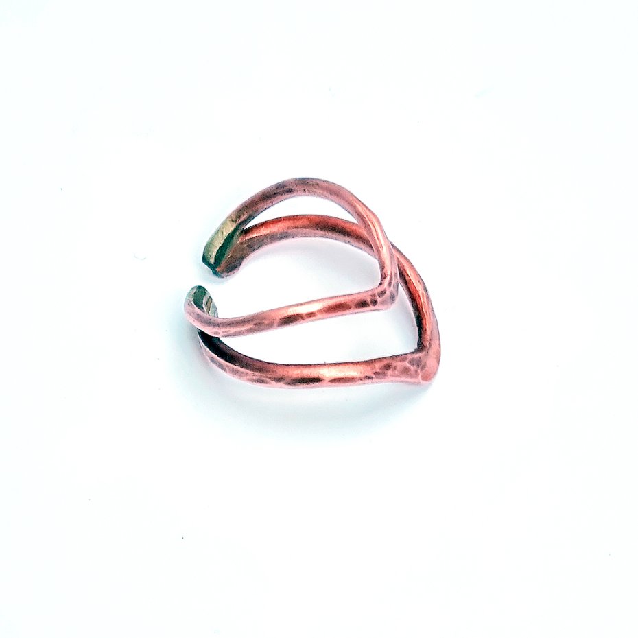 Pierścionek wykonany z czystej, polskiej miedzi, z drutu fi 2mm i fi 2,5mm. Elementy zlutowane twardym lutem srebrnym odpowiednio kształtowane i ręcznie kute, ręczne przecieranie naturalna oksyda ogniowa. Każdy egzemplarz będzie nieco inny, widoczne jest lutowanie. Pięknie prezentuje się na długich palcach, choć można regulować odległości V.