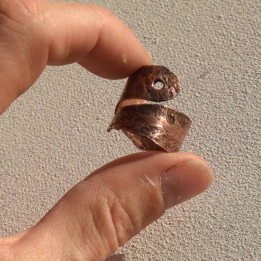 Pierścionek wykonany z ręcznie kutej, oksydowanej miedzi, częściowo przecieranej papierem ściernym, o surowym charakterze stylizowanym na stary, "wykopaliskowy" metal. Średnica ok. 19 mm. Szerokość 10-20 mm.