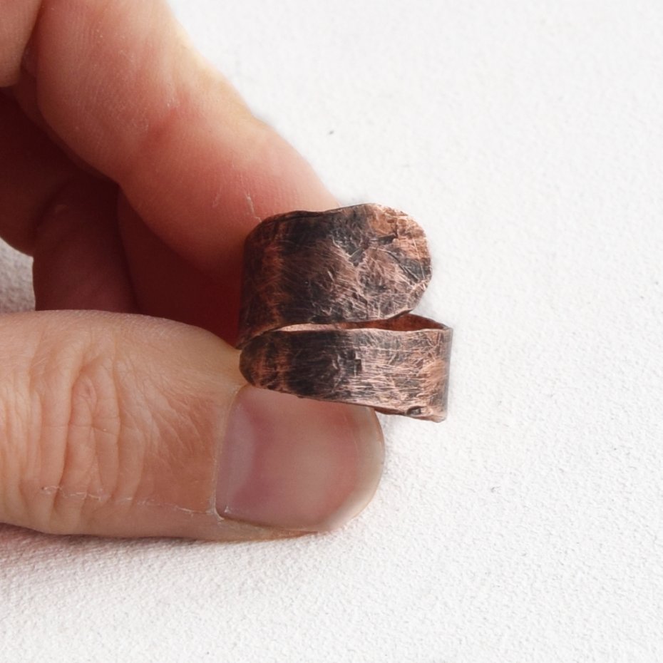 Pierścionek wykonany z ręcznie kutej, oksydowanej miedzi, częściowo przecieranej papierem ściernym, o surowym charakterze stylizowanym na stary, "wykopaliskowy" metal. Średnica ok. 18 mm. Szerokość 7-18 mm.