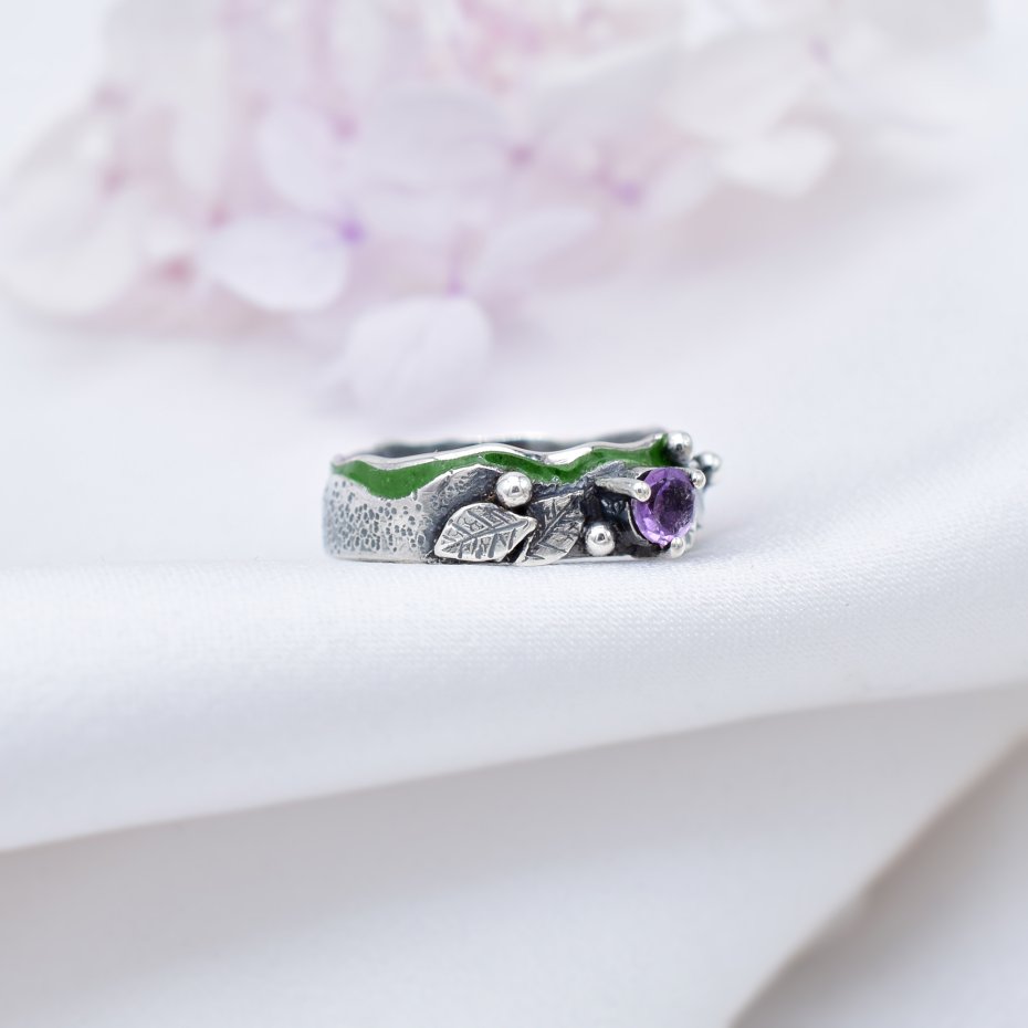 Tagi: #pierścionek artystyczny, #pierścionek baśniowy, #pierścionek z ametystem, #pierścionek z listkami
