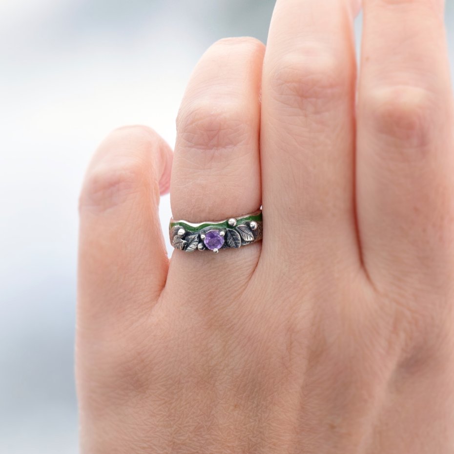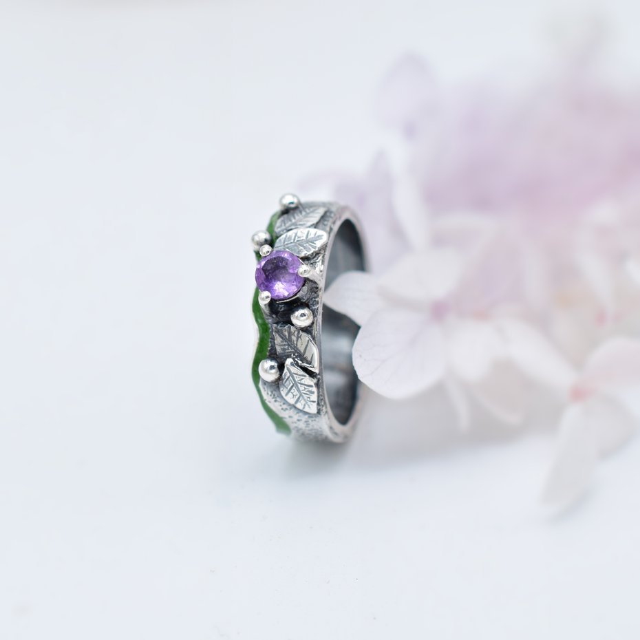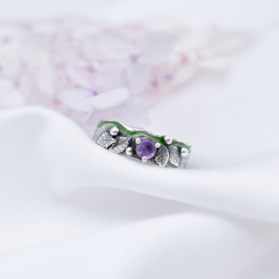 Wyjątkowy pierścionek w leśnym, lekko baśniowym stylu. Delikatne srebrne listki i zielona, falista wstęga oplatają obrączkę, tworząc subtelny kontrast z osadzonym w centrum, fioletowym ametystem. To idealny wybór dla osób, które kochają roślinne motywy, ręcznie tworzoną, artystyczną biżuterię i oryginalne dodatki.