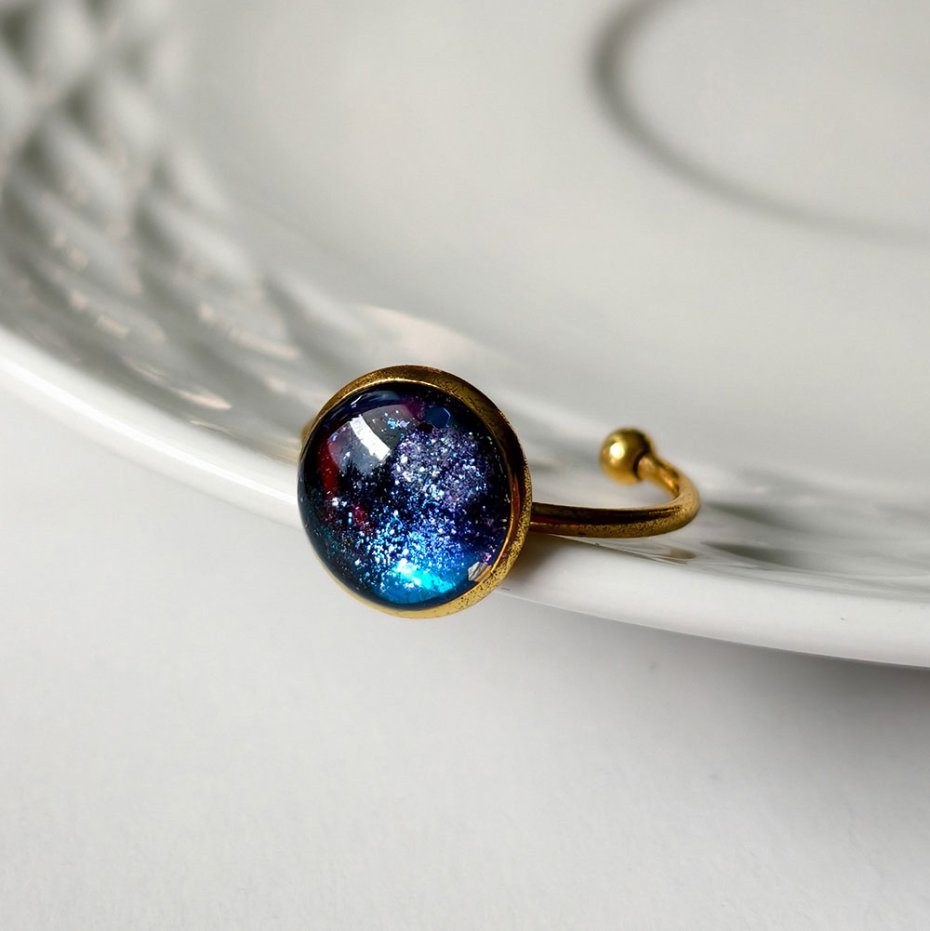 Wyjątkowy pierścionek z pozłacanej stali szlachetnej, w którym zamknięto hipnotyzujący kosmiczny pyłek zatopiony w przejrzystej żywicy. Delikatnie połyskujące drobinki tworzą efekt głębi i przypominają rozgwieżdżone niebo, dzięki czemu każdy pierścionek wygląda jak mały fragment wszechświata.