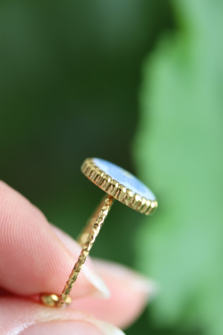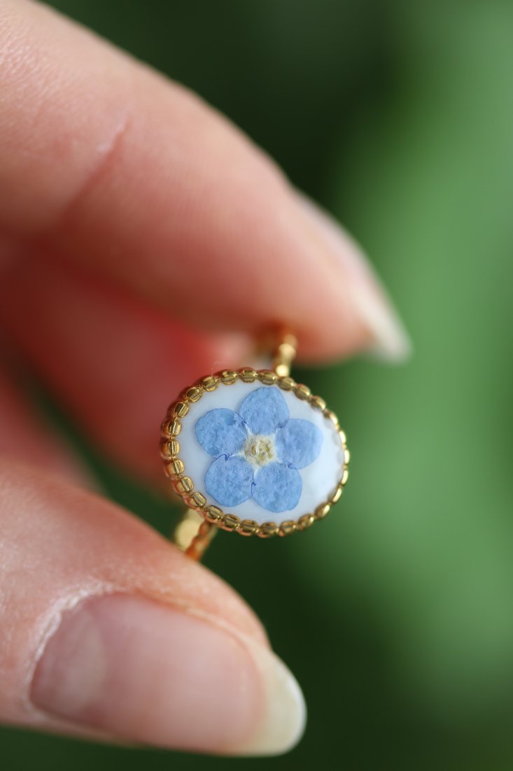 Delikatny pierścionek z zatopioną w żywicy epoksydowej prawdziwą niezapominajką. Subtelny, romantyczny akcent, który zatrzymuje w sobie odrobinę natury i wspomnień.