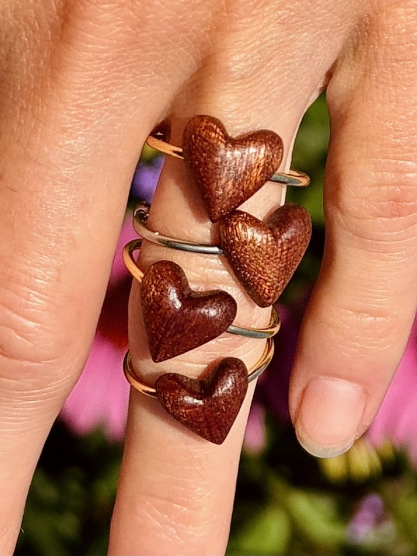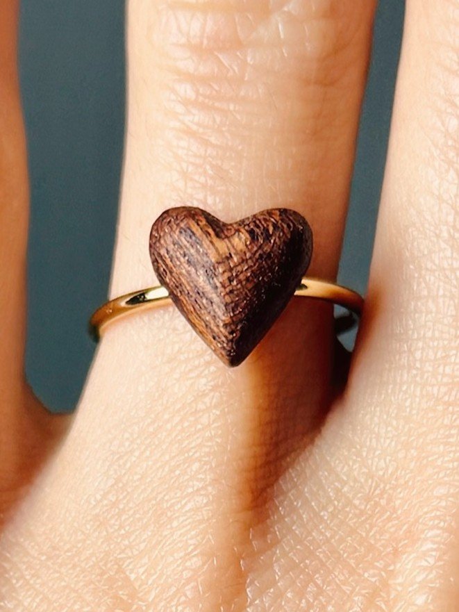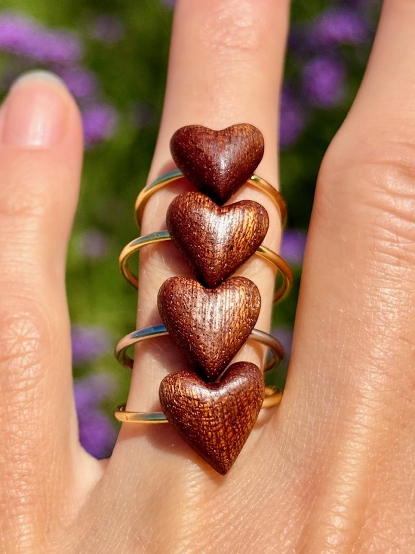 Na delikatną regulowaną obrączkę wykonaną z pozłacanego 14-karatowym złotem mosiądzu nasadzone zostało drewniane serduszko, wykonane z drewna sapeli, które dodaje całości naturalnego uroku i oryginalności. Dodatkowo pierścionek z tyłu wykończony jest małymi kulkami, które mogą pełnić funkcję antystresową.