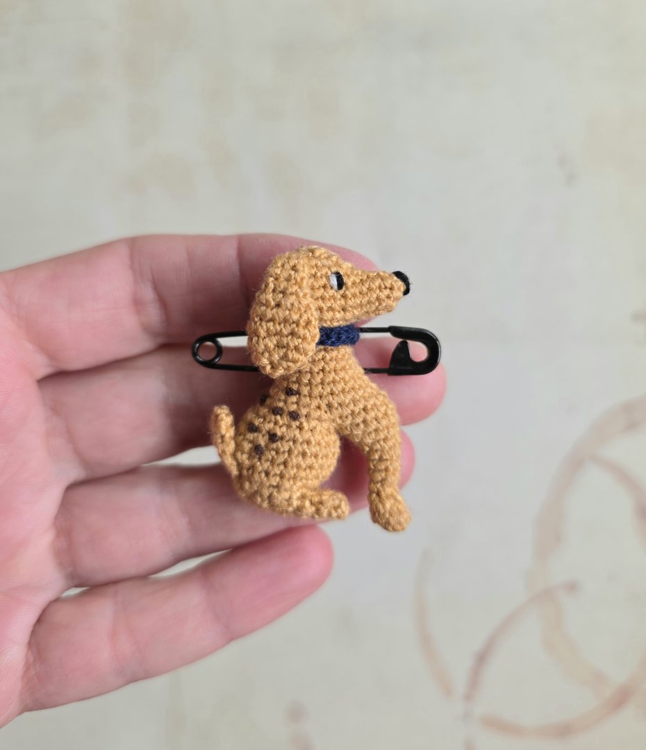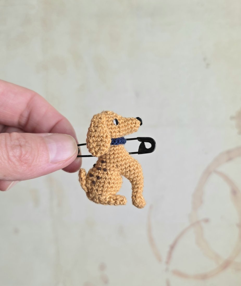 Malutki piesek w postaci przypinki, na czarnej agrafce. Piesek ma około 4/3 cm.