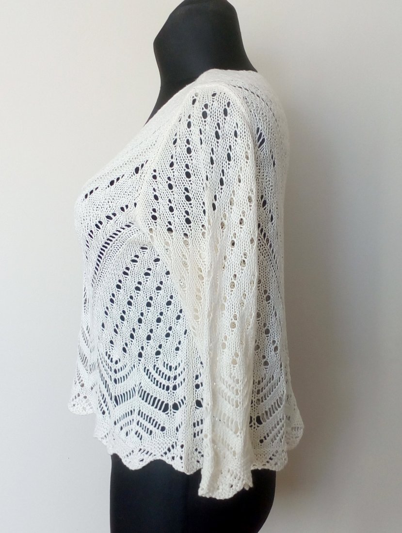 Krótki, ażurowy sweterek w kolorze ecru, z dekoltem w serek, rękaw o długości 3/4, dół swetra i dół rękawów lekko ząbkowane