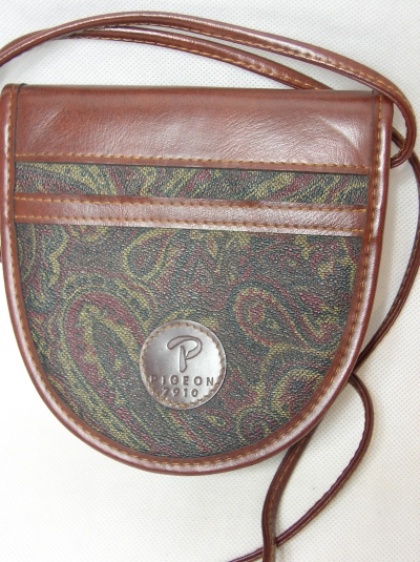 Mała ,sympatyczna torebka zapinana na zamek magnetyczny.Przód,lamówki i pasek z brązowej skóry ekologicznej.Tył i boki czarne.Przód -wstawka ,syntetyk w wzory tureckie+logo P pod spodem PIGEON 7910.Podszewka czarna,syntetyk.Jedna komora+kieszeń na zamek.Ze środka wychodzą dwa paski do noszenia na ramieniu.Stan bardzo dobry.Wysokość 16,5 cm,szerokość 17 cm,pasek 58 cm.