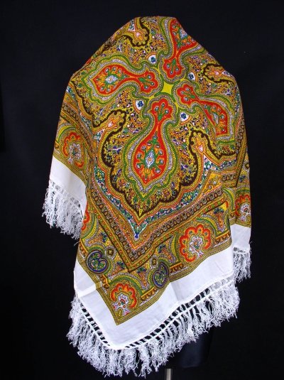Chustka w stylu ludowym w kolorowe wzory.Materiał wełna.Brzegi obszyte białymi,ozdobnymi frędzlami.Stan bardzo dobry,brak śladów używania.Długość boków bez frędzli 73 cm.