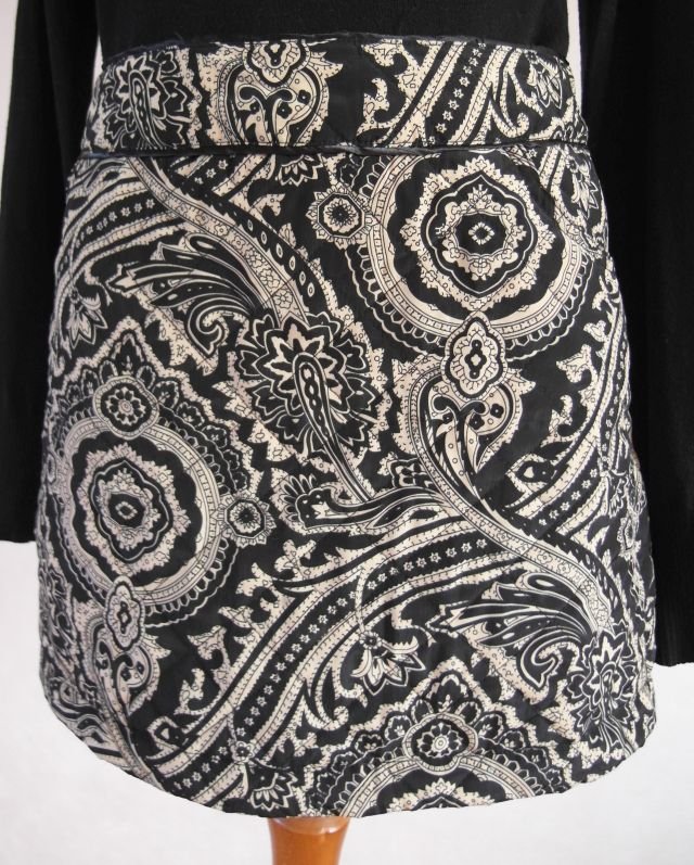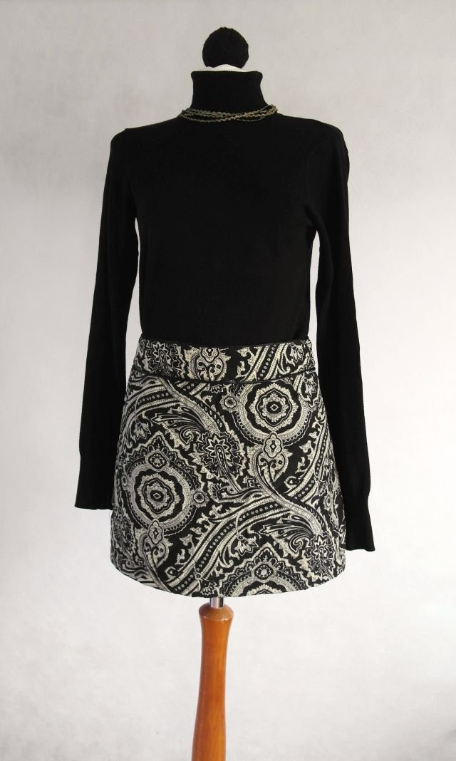 Wzór ornamentowy, beżowo czarny. Z boku kieszonki, z tyłu na suwak.Lepiej wygląda noszona na biodrach. Lekka, efektowna.
