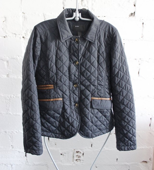 Pikowana granatowa kurtka z lamówkami z eco-skóry. Firma Icon. Rozmiar 40/L. Wymiary: obwód biustu-50cmx2, obwód pasa-43cmx2, szerokość dołu-51cmx2, długość rękawa-64cm, długość kurtki-60cm.