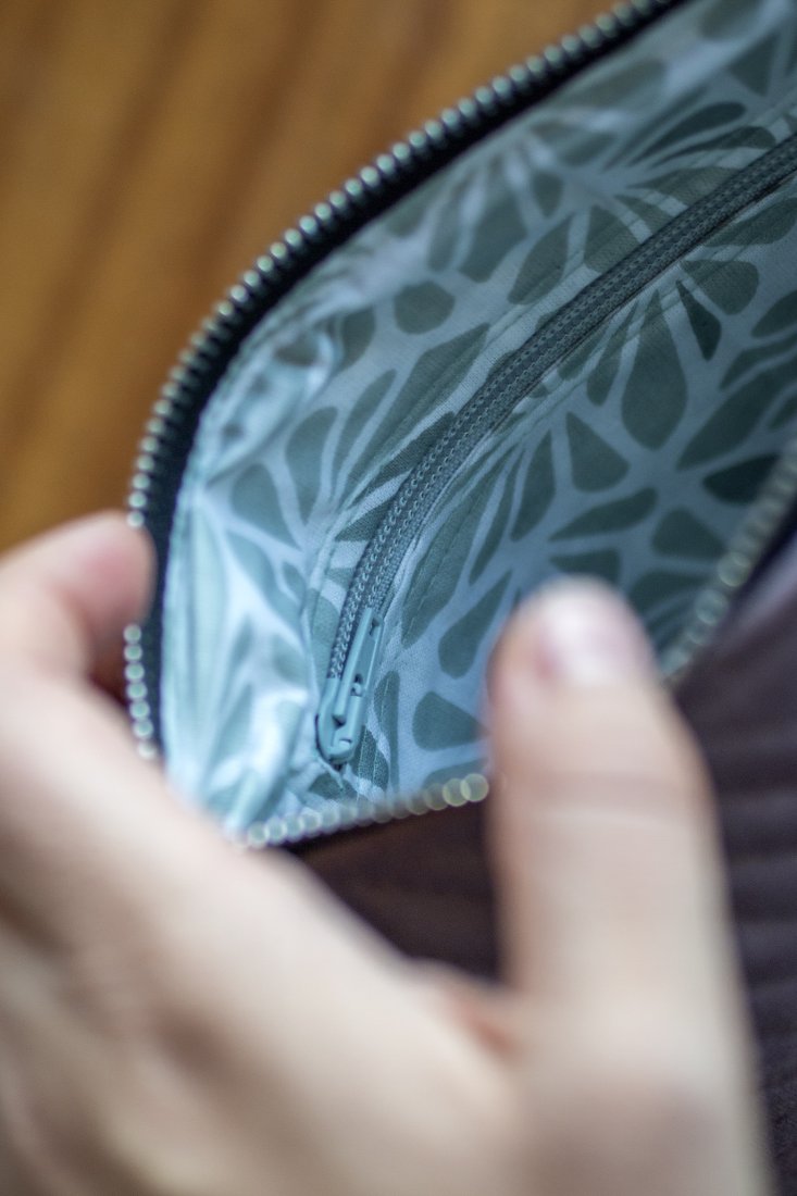 Małe zaszewki na dnie. Z tyłu oraz w środku torebki kieszonki zapinane na suwak. Środek wykończony bawełnianą podszewką.